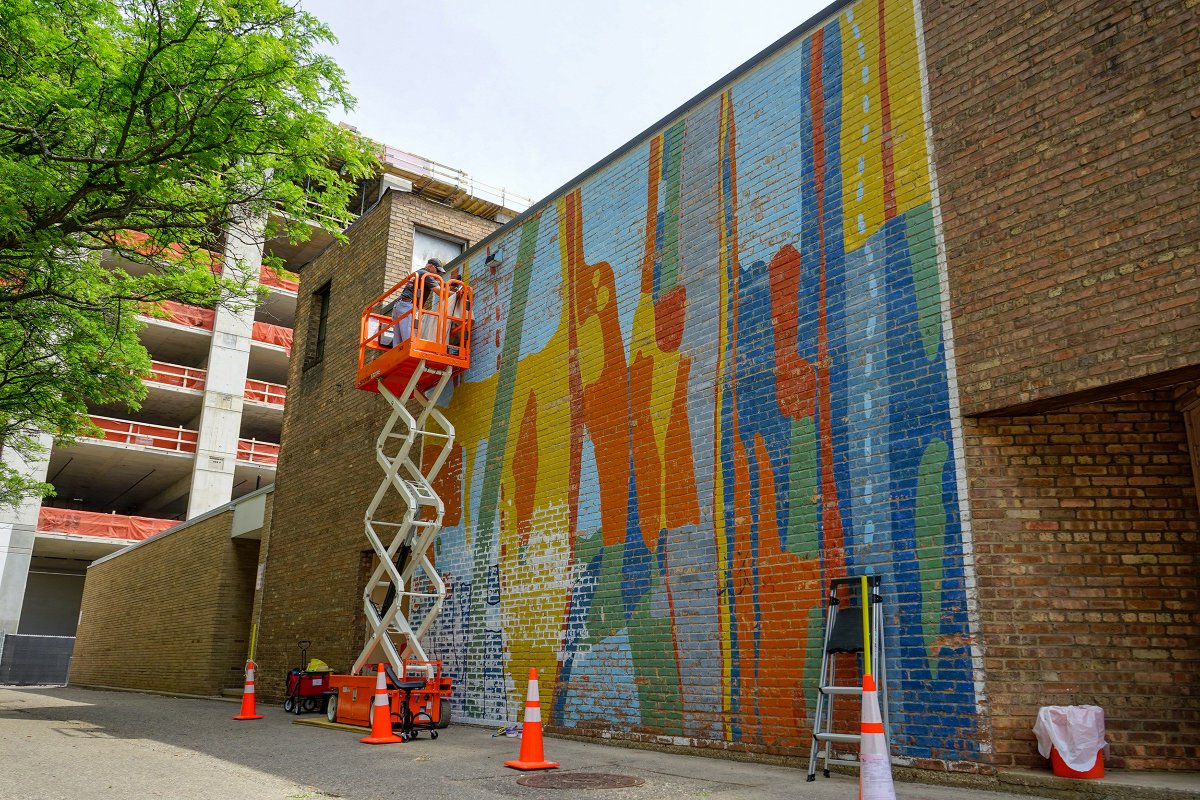 Neat to see this 44 year old mural being restored, and by the original artist, no less. Colleen Rockey, A WMU alum who originally painted the mural on a Corporation Alley wall facing the Comerica Building of the in 1974 (the same year that she graduated college), is restoring the mural at her own expense. The below image shows the mural restoration in progress, with The Exchange rising in the background.