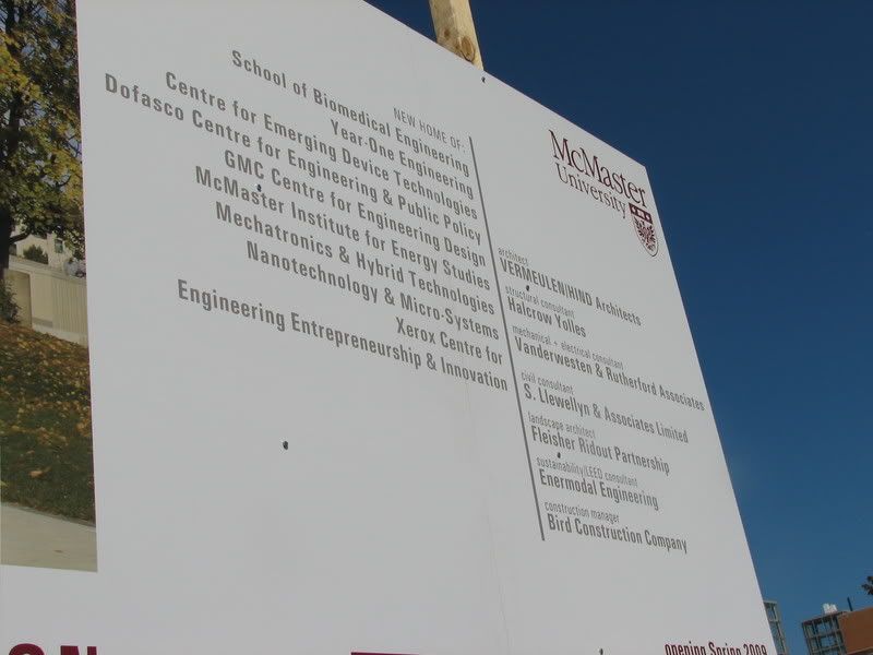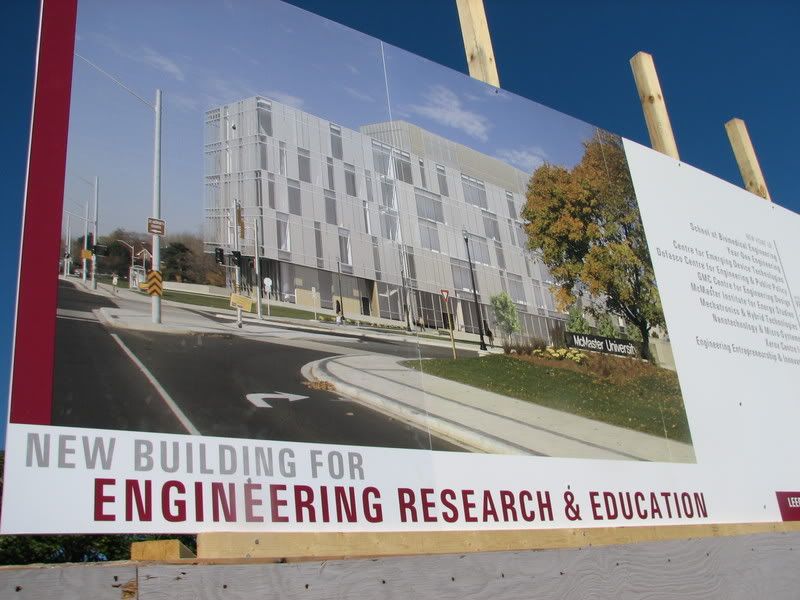 http://ppims.mcmaster.ca/constructio...ngineering.jpg Cost: $ 38,000,000 Architect: Vermeulin Hind Architects Contractor: Bird Construction (Construction Mgr) Timeline: June 2007 through June 2009 Project description: Supporting the Faculty of Engineering’s expansion into emerging areas of research and study, is the construction of a state-of-the-art engineering building. The five-storey, 125,600 square-foot facility will provide much needed space for three recently launched graduate schools in Biomedical Engineering, Engineering Practice, and Computational Engineering and Science. Space is also designated for new research initiatives in mechatronics, energy studies, and micro- and nano-systems. Teaching studios, tutorial rooms, study space, and classrooms will support recent initiatives enhancing the first-year undergraduate experience. The building is designed to a high LEED (Leadership in Energy and Environmental Design) environmental standards and as a teaching tool. It is located near the campus’ Main Street entrance and scheduled to be completed during summer of 2009. Construction is well underway and the first floor structure will be completed in early November. |