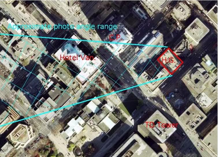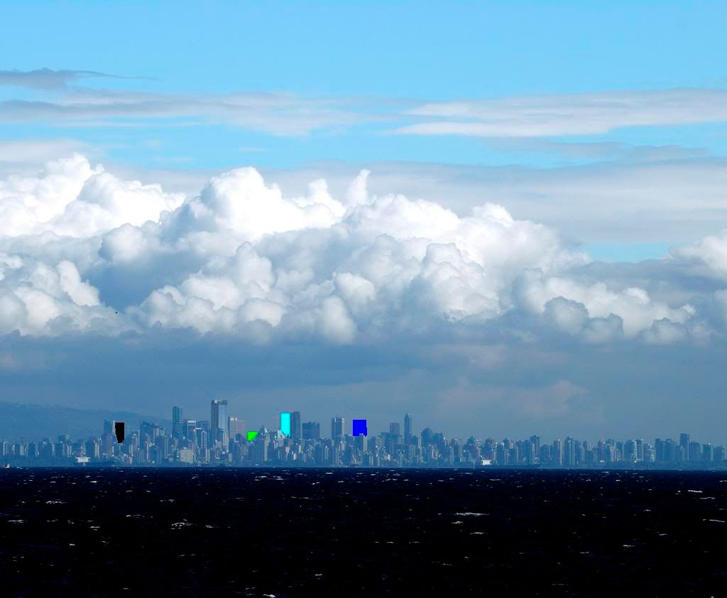 Black is where Fairmont Pac Rim should be, green is what little of Woodwards you'd see (maybe a bit taller), light blue is where Hotel Georgia should be, and dark blue is where capitol should be. hope that helps as a bit of a guide. I don't really know what other significant projects there are at the moment. |