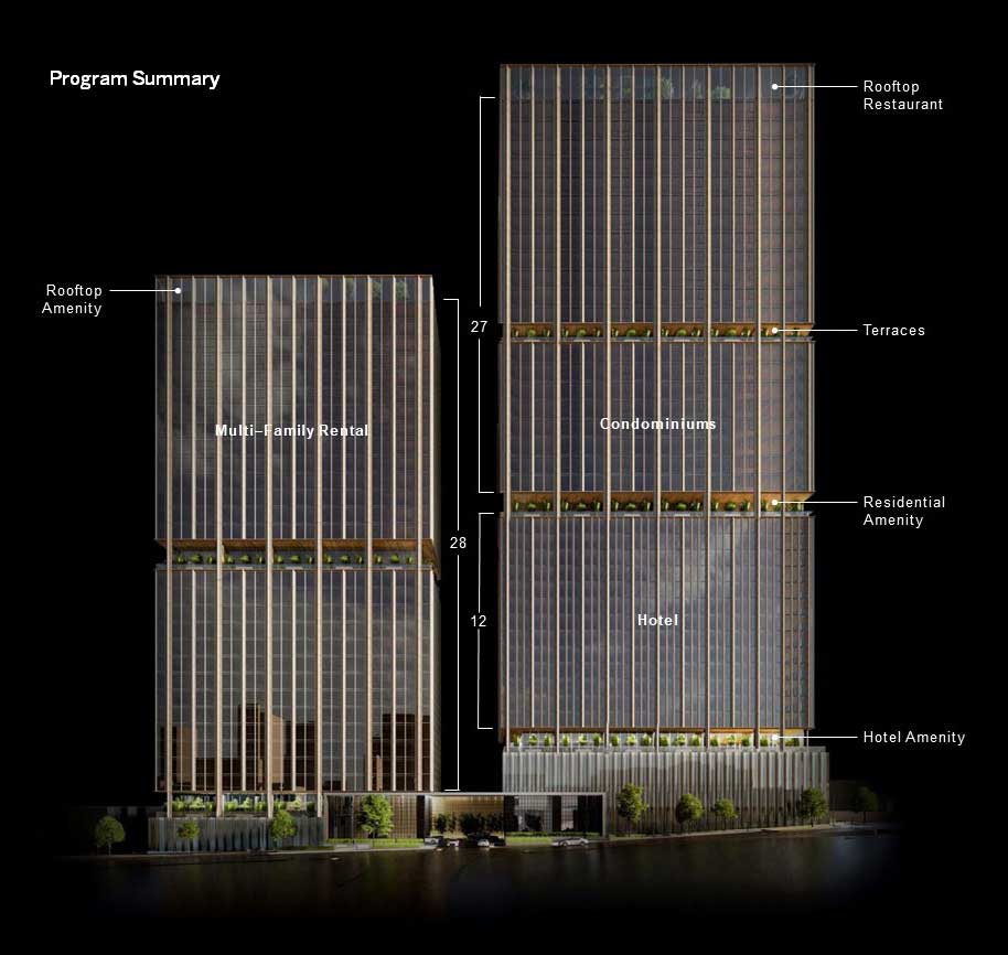The project includes a 46-story tower that will be home to 240 luxury Ritz-Carlton Hotel rooms and suites in addition to 150 condominiums, a 560-space parking garage and a rooftop restaurant. A neighboring 32-story tower will house more than 185 multifamily rental units branded with the hotel's name along with a slate of amenities.