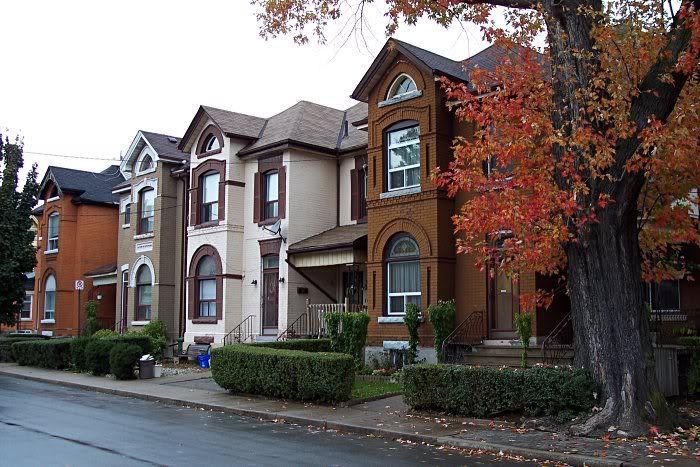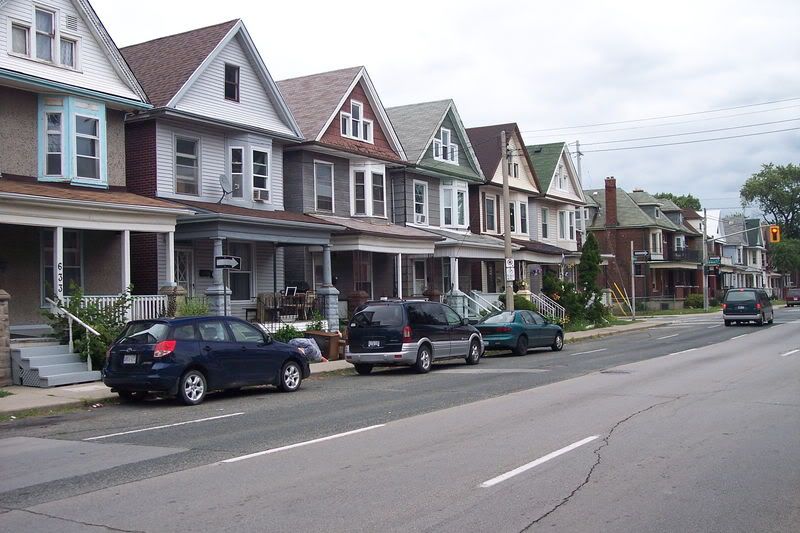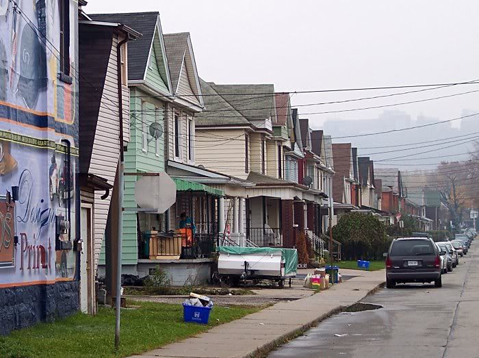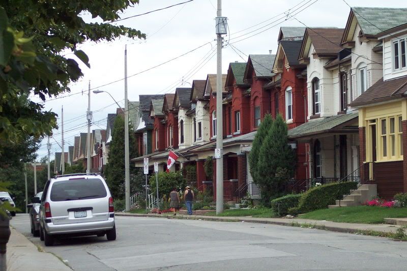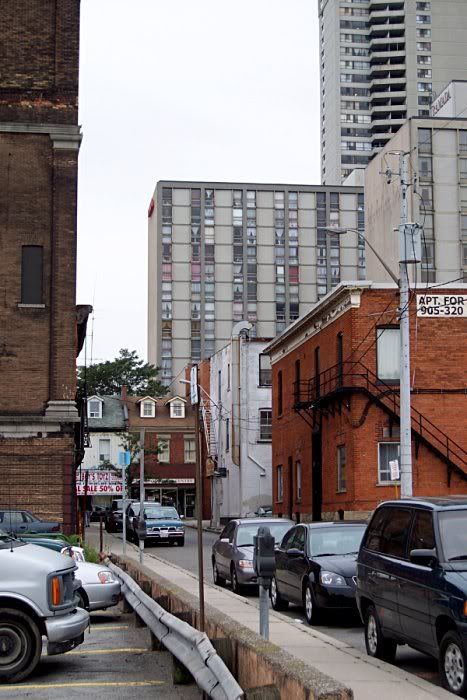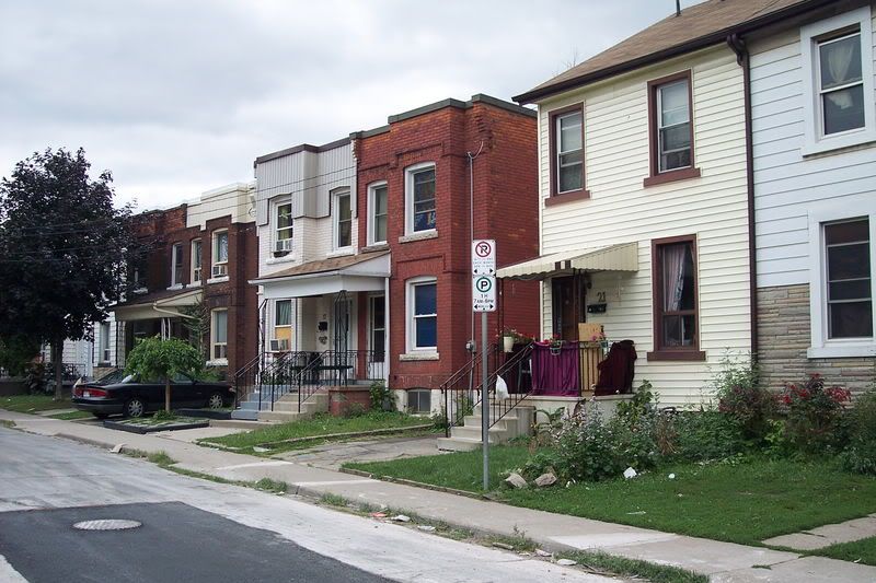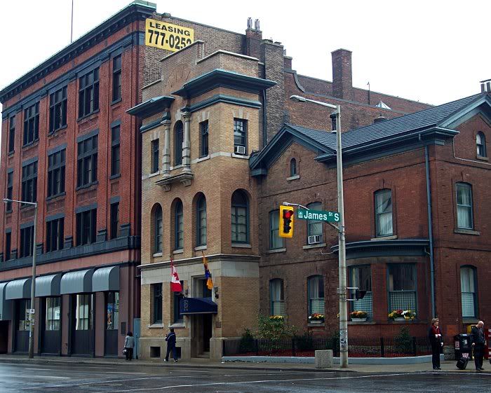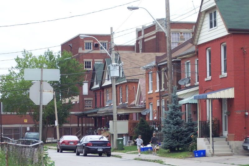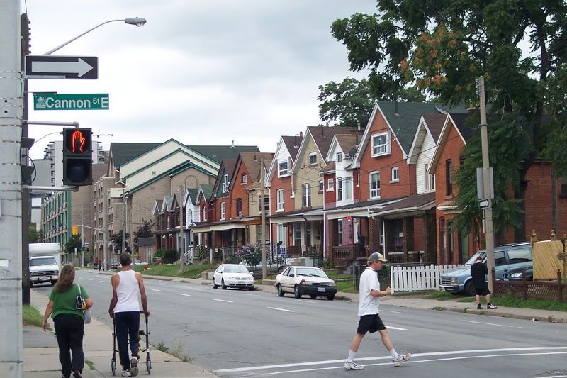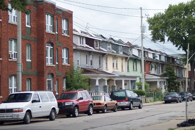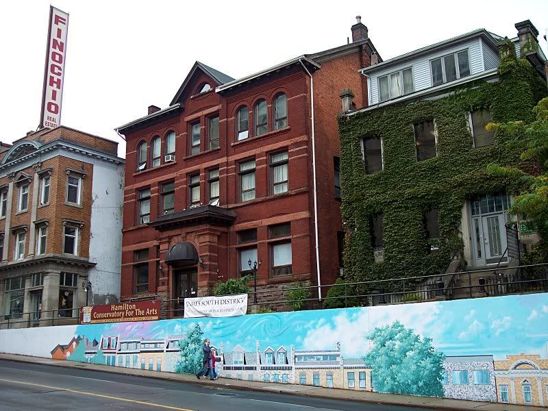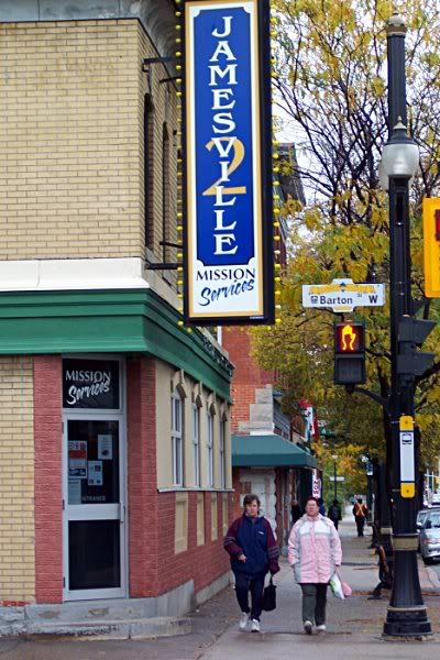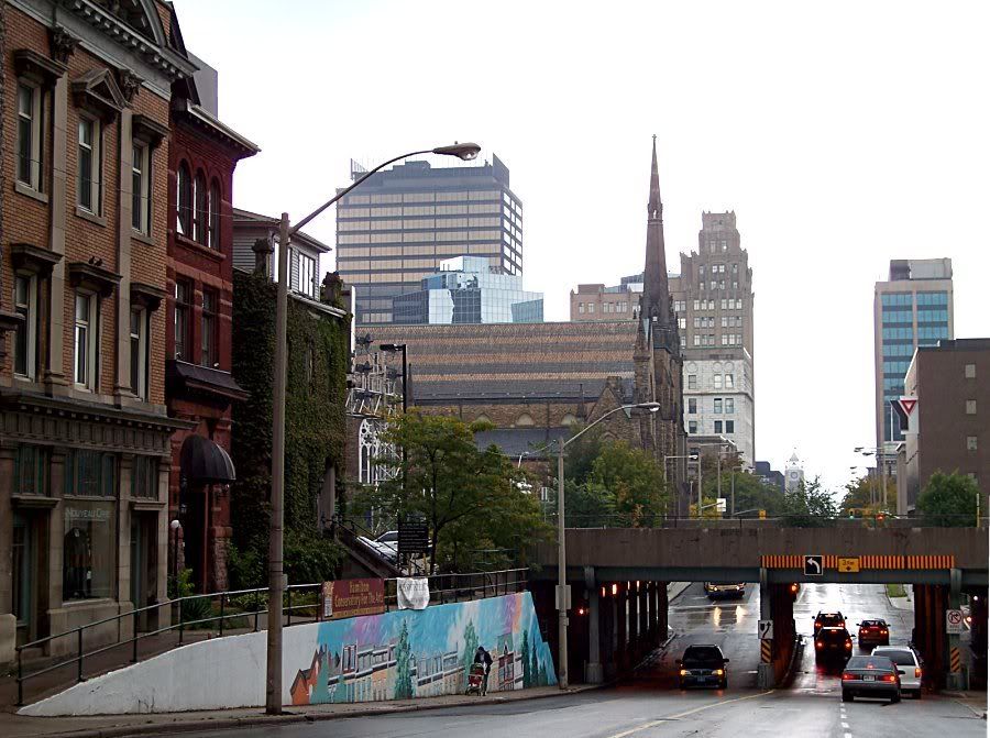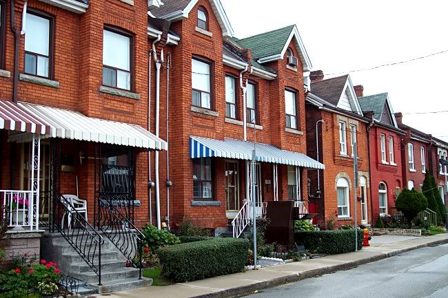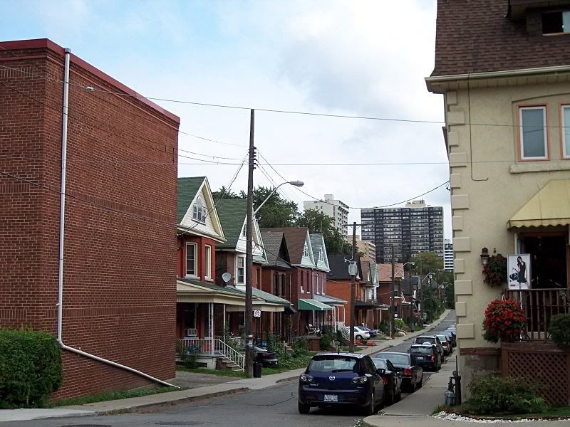 Jamesville is an historic neighbourhood along James St. North. There is a real old world feel here with the colourful homes, lush gardens, outdoor markets and bustling pedestrian traffic. Many languages are spoken in Jamesville, especially Italian and Portuguese. In recent years it has also become the centre of Hamilton's arts community. Here's Jamesville on a rainy Friday morning: