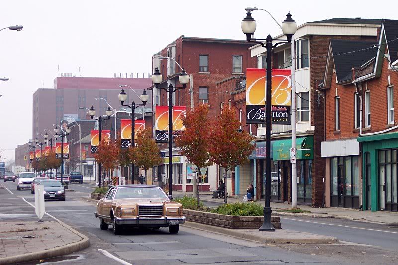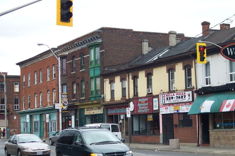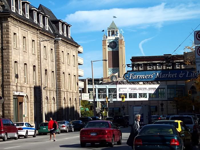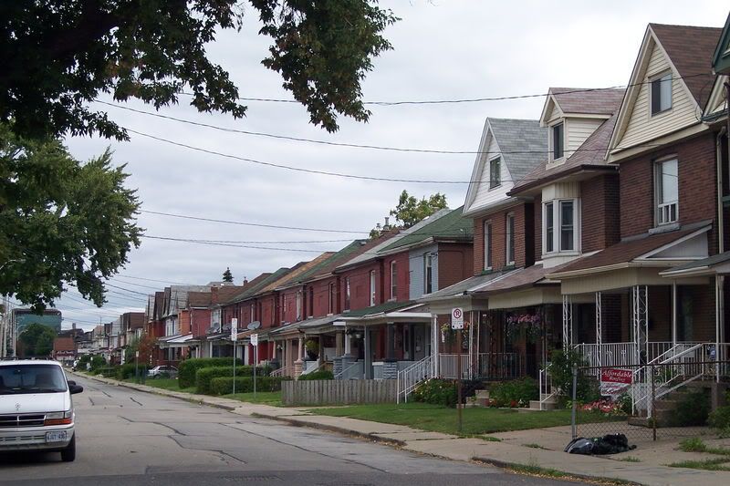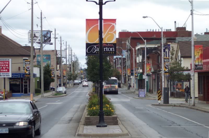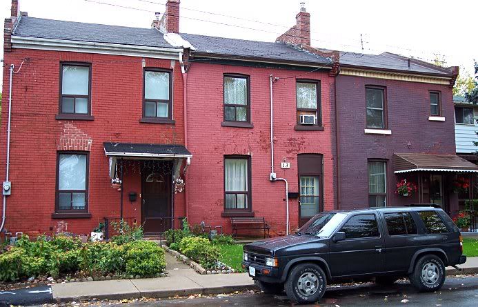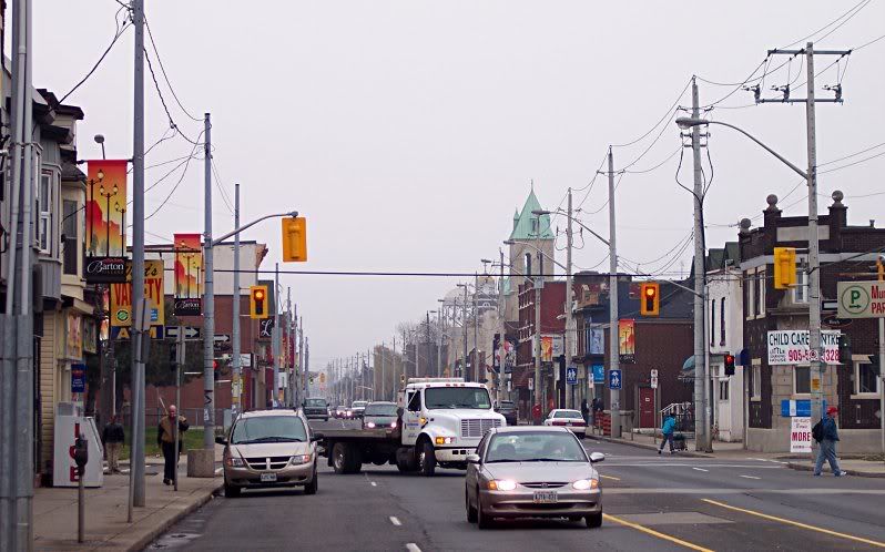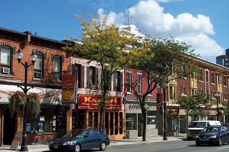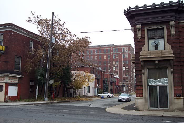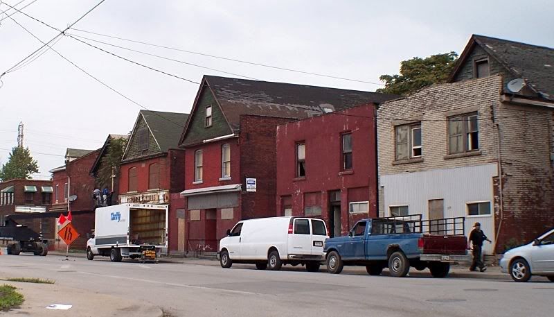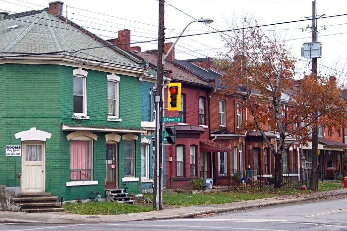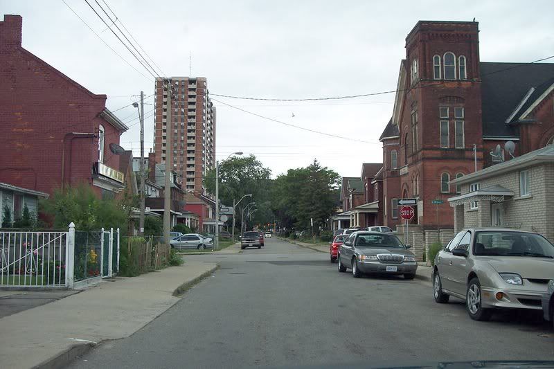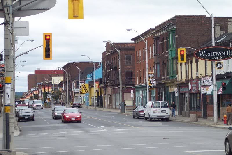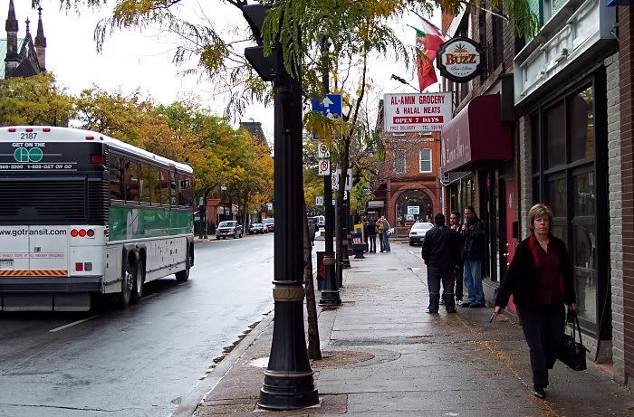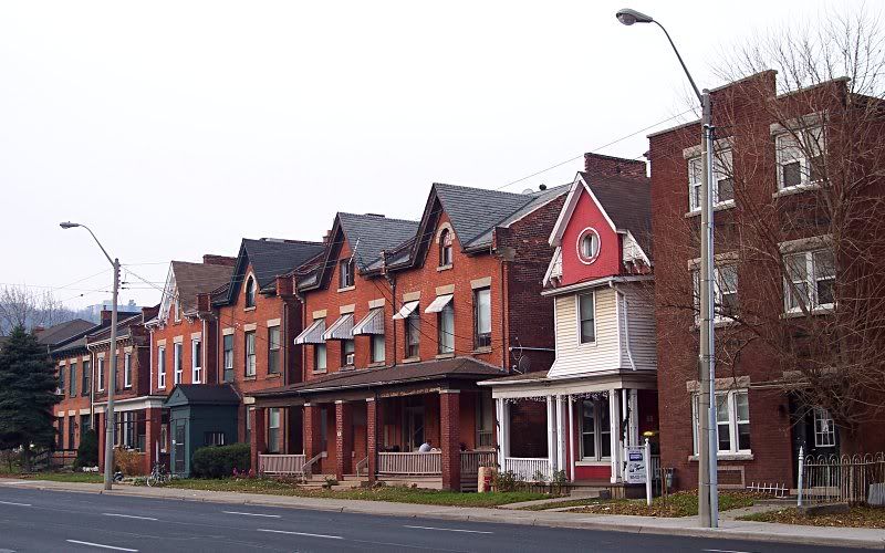 Jamesville is an historic neighbourhood along James St. North. There is a real old world feel here with the colourful homes, lush gardens, outdoor markets and bustling pedestrian traffic. Many languages are spoken in Jamesville, especially Italian and Portuguese. In recent years it has also become the centre of Hamilton's arts community. Here's Jamesville on a rainy Friday morning: