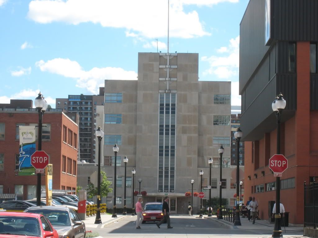 I think it was the Hamilton Hydro or Electric Company building. It was originally a 3-storey building but they added another 3 floors in the 60s. If you look closely at the curvy bit, you can see a slight difference in the stone. The old part ended with the first course of stone above the window. They did a really nice job and it has long been a favourite of mine. The TH&B Railway station (now GO Transit station) is another stunning moderne building in Hamilton.