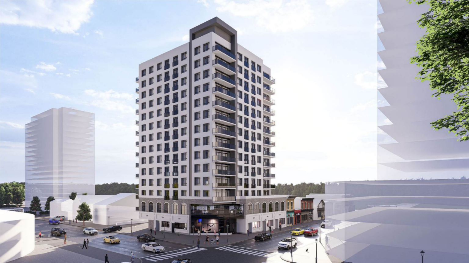 To develop a 27-storey, mixed-use building with 1,165.97 m2 of commercial area and 324 dwelling units with 134 vehicle parking spaces located underground and within the second-floor podium.