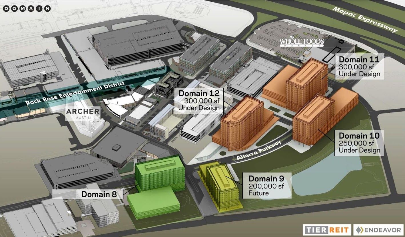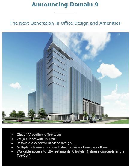 Domain 11 has 14 foot slab-to-slab heights with a stated roof height of 235 feet with 15 floors. Dividing the height by the floors you get 15.6666666667 feet. So that should put Domain 9 around 204 feet. That's going to be four 200 footers pretty close together. Throw in Domain Tower at 181 feet, Domain 8 at 167 feet, plus the Archer Hotel and Maravilla at the Domain and the dozen or so nearby high rises outside of the Domain and there's a decent skyline starting to take shape up there.