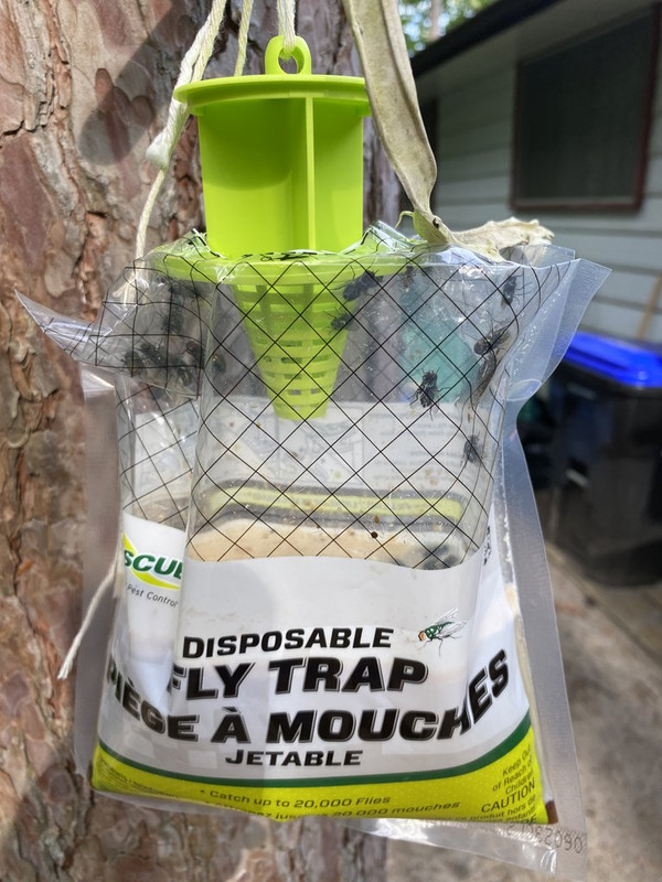 And flies started up again. Put out the new fly trap I saw others use. Within 45 minutes it was starting to fill up.