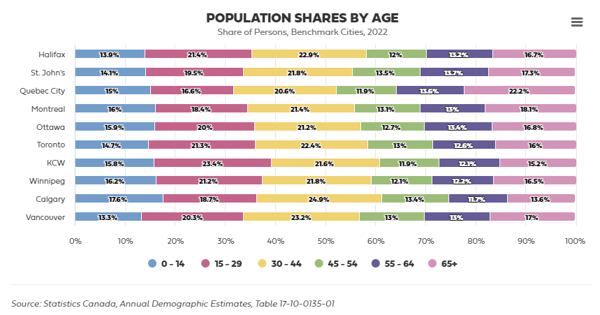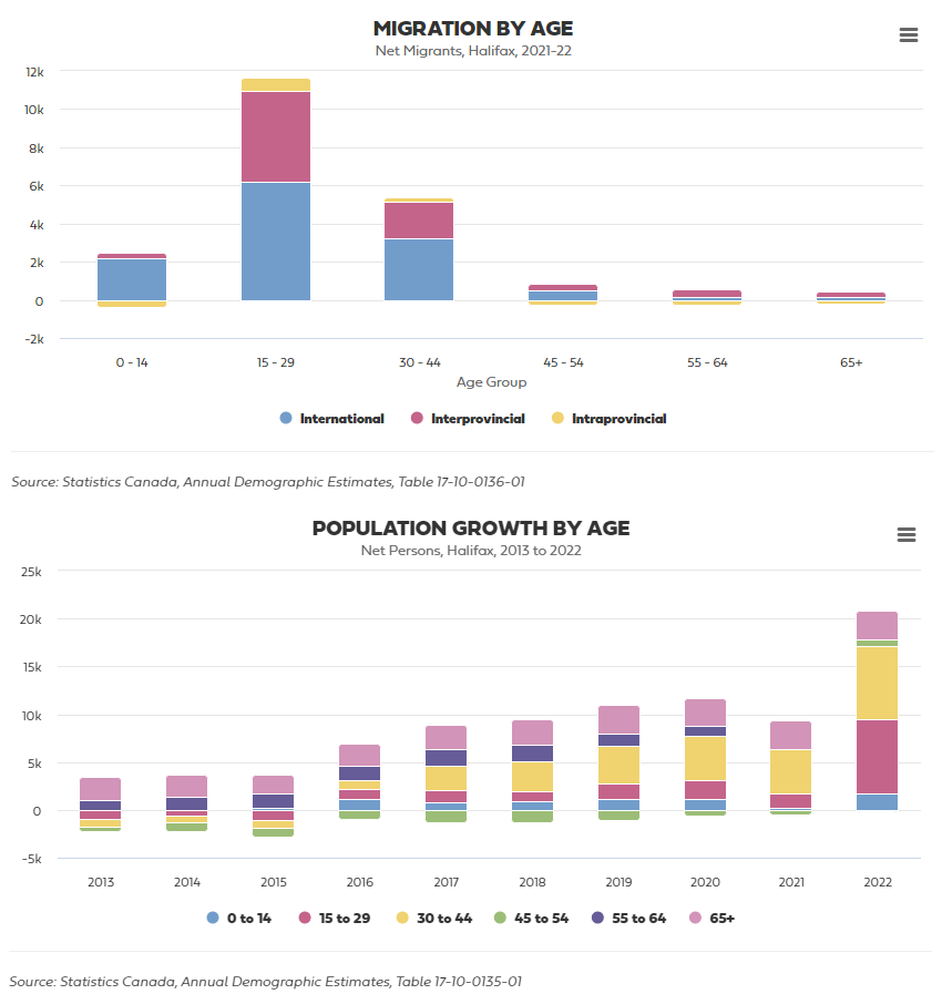 The global city trend is one where the share of families with children declines, but is made up for by a growth in childless workers. You see this in places like New York, London or Toronto where, unless you're rich or you're an immigrant with a lower bar for living standards, raising kids is kind of a bad proposition. But if you're a young adult who's childless, it's a place to get a good job and establish yourself, even if you have to live in an expensive apartment with roommates, and then you have a decent dating pool. I'm not sure if this is what's happening in Halifax, but the graphs q12 posted that shows the growth in the 15-44 age segment and how the vast majority of children who move to Halifax come from overseas seems to align with this.
