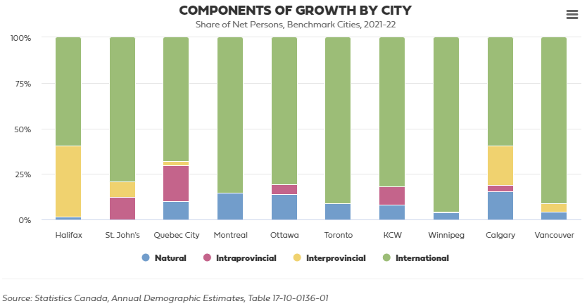 I don’t think this is exactly what’s happening, though—over the past ten years, the per-capita growth in the under-14 population in Halifax has been pretty dramatic, and greatly exceeded the CMA average across Canada. It is true that most of these people are immigrants rather than interprovincial migrants--in 2021/22, Halifax got only 264 people 0-14 from interprovincial migration. Immigration in the same age group was nearly 1,800.