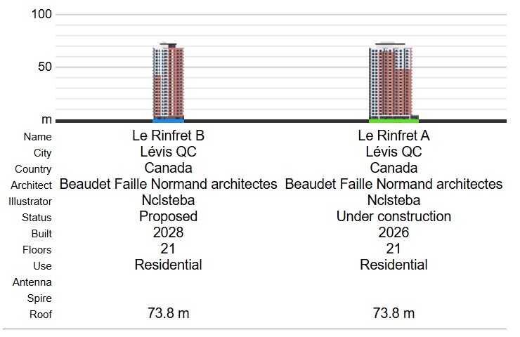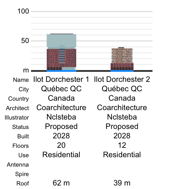 Ce serait formidable de voir la tour de l’îlot Dorchester intégrée dans le diagramme. Après tout, c’est la seule tour de 20 étages en planification dans le centre-ville depuis des années. Ce projet représente une rare opportunité pour Québec de densifier et moderniser son cœur urbain.
