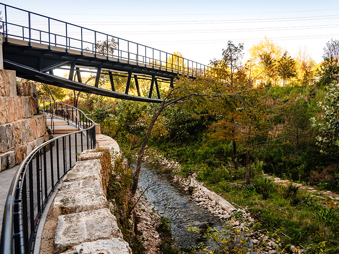 - An 800-foot-long boardwalk embedded in Waller Creek, bypassing intersections at Red River St. and Cesar Chavez St.