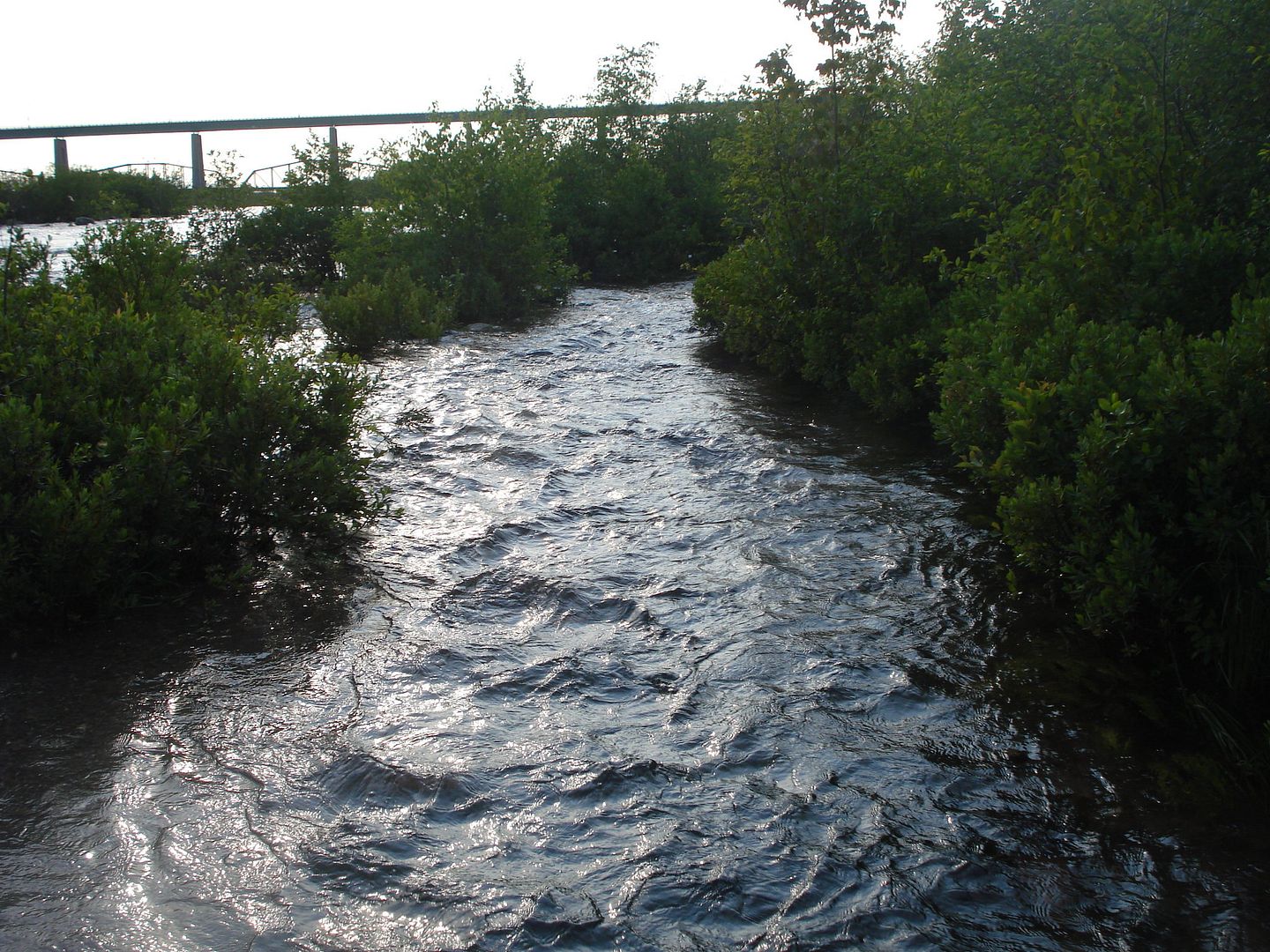 The water from the rapids is spilling onto the island.