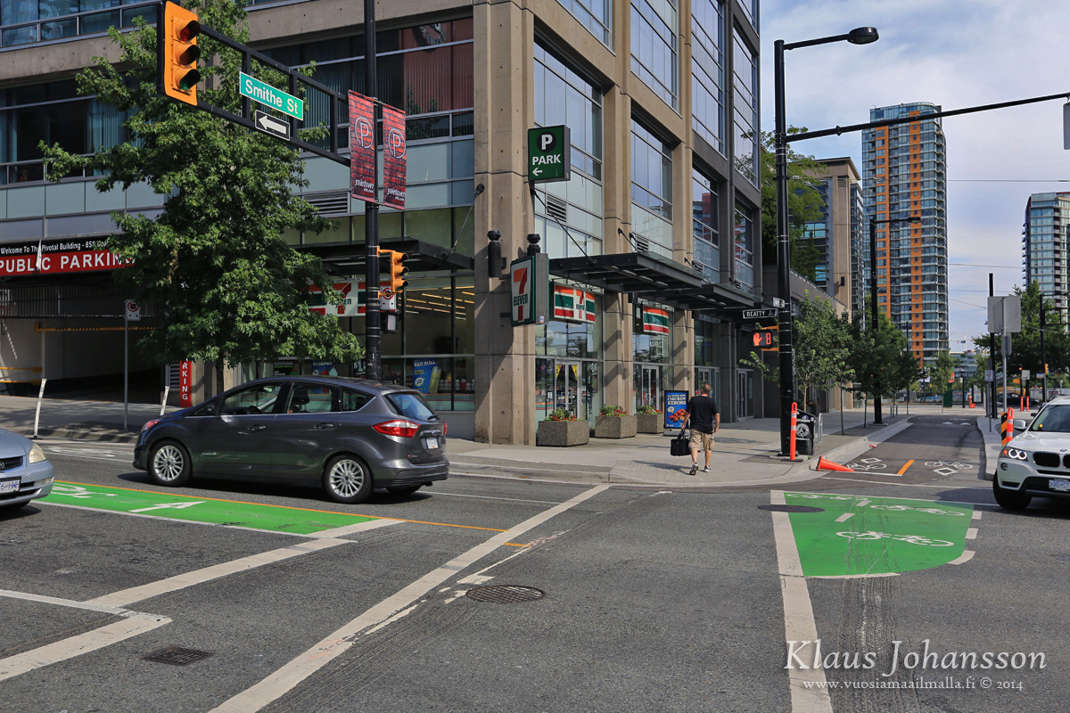 most cyclists it is perceived as being too dangerous to contemplate, and instead they proceed through the intersection in the curb lane adjacent to the crosswalk, or in it if intersection through traffic is heavy, and they then stop at the far corner and reorient before crossing in the curb travel lane at the next cycle of the lights. This "two point left turn" allows a cyclist to safely make a left turn at a major intersection but to pedestrians and drivers it appears as if the cyclists is 'acting like a pedestrian' by using the crosswalk and not turning left like a car. Most drivers and pedestrians are long gone by the time the cyclist completes their two point turn and give it no further thought, save for mentally adding another 'transgression' to naughty-or-nice register of cyclist behavior. Rhetorically, how many parents on this forum would take their kid for a ride and make a left turn in the street at, say, 41st and Cambie? How about Number 3 Road and Williams Road in Richmond, where there are no side streets or alternatives to the major road grid? Both those examples include bike lanes on one of the intersecting streets and are, thus, preferred bike routes in a city.
