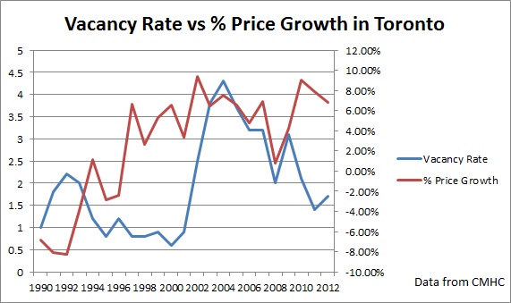 There was a massive demand for rental in Toronto during the time rental controls were lifted. On the long term, vacancy rates soared to 4% once demand flatlined, and rent price growth dropped to 1%, until the demand started to soar again.