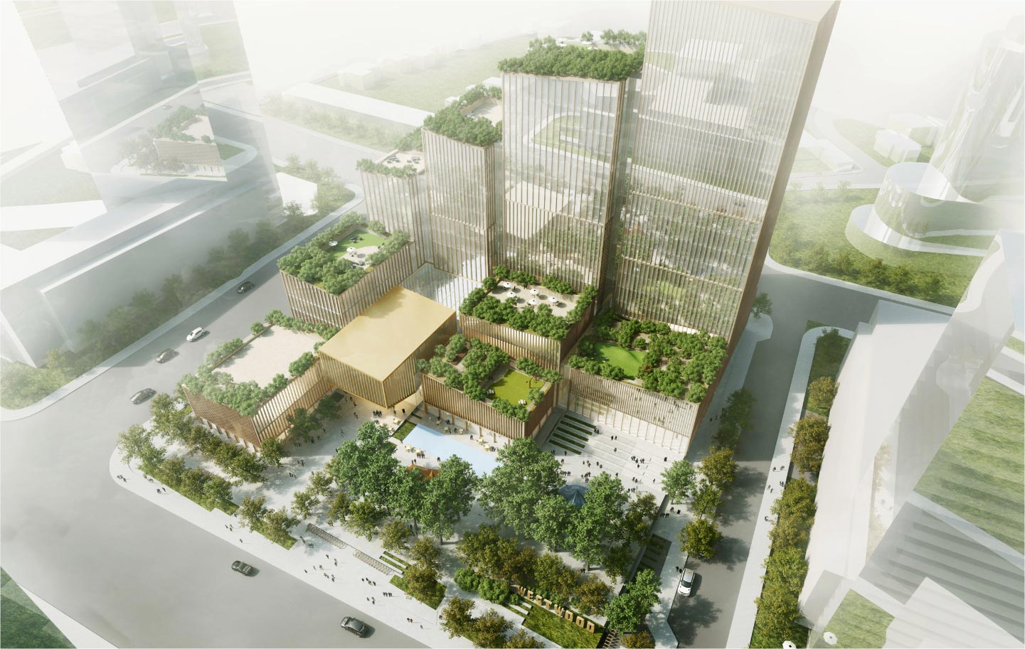 - the podium would be clad with an undulating pleated glass curtain-wall wrapping the edges of the public park.