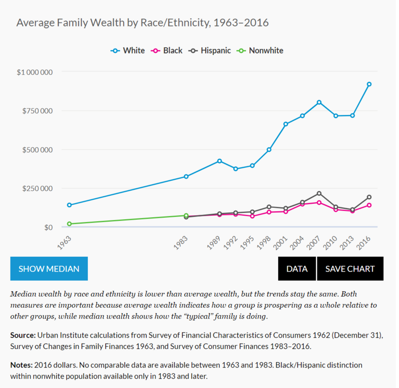 Look closely. Something interesting happens in 1983. Pre 1983 there were only two races. White and non-white (which presumably included Asians) and then post 1983 there are 3 races. White, Black and Hispanic. Asians and even Middle Eastern people (who have also done well in the last few decades) are omitted for some odd reason. Seems blatantly.........curious, doesn't it? But this is from Urban Institute. Outside of big cities in middle income areas, the lines trend a bit closer, and the average white family makes significantly less than a million annually. This graph only shows the baffling wealth inequality prevalent in big.......Non-Red cities.