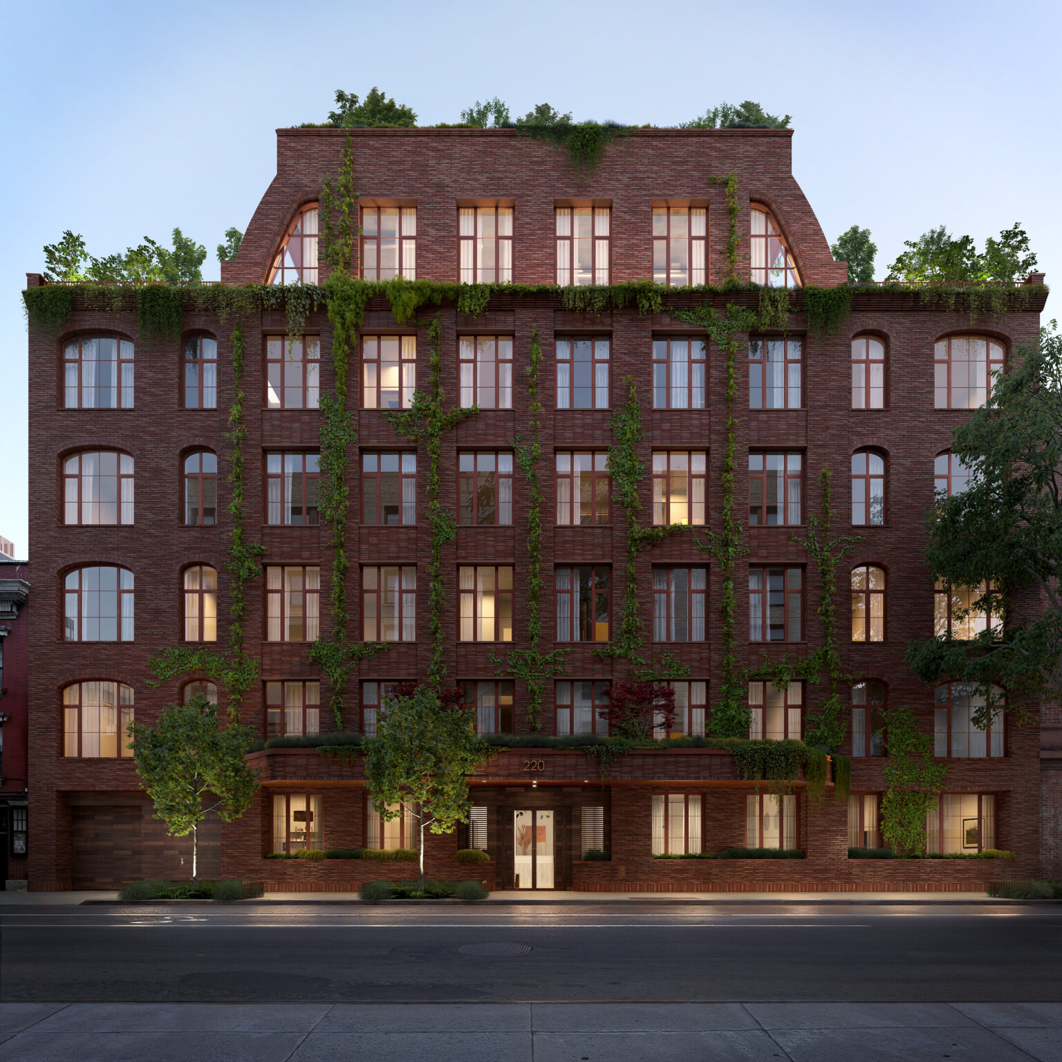The renderings above and below show the intricate red brick masonry façade and recessed industrial-style windows. The final floor is set back from the street and features angular walls on the eastern and western ends, and the entire structure is depicted covered with an abundance of climbing vegetation.