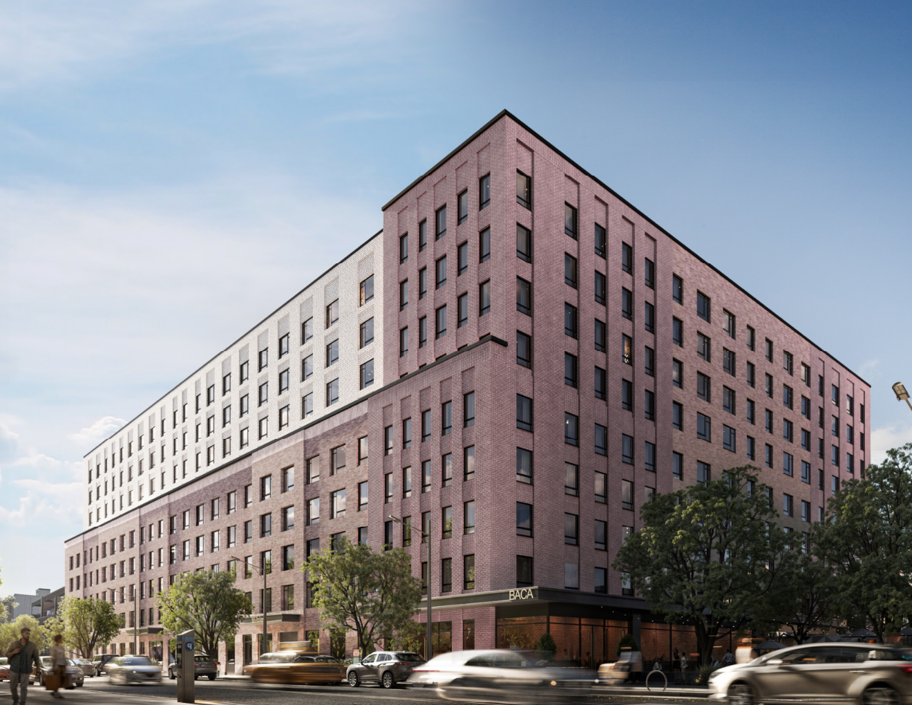 The rendering shows the structure with a largely monolithic massing with a setback spanning the entire eastern elevation at the sixth story. The façade will be composed of red brick surrounding a grid of recessed rectangular windows with black frames, while the upper four stories above the eastern setback will feature a contrasting white exterior. A landscaped plaza appears to be positioned at the northern end of the property.