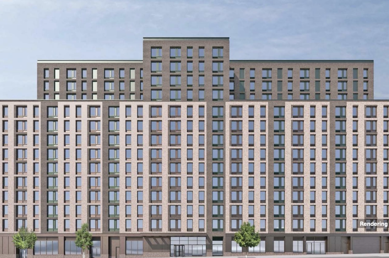 The above rendering was included in sale materials, depicting an example residential development that could be built on the site. The render features a symmetrical façade with alternating vertical bands of light and dark brick, large windows, and ground-floor retail spaces with street-level plantings and regularly spaced trees.