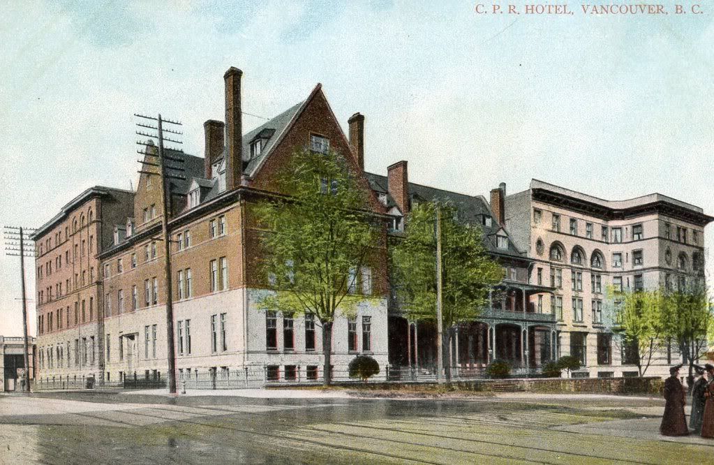 A CPR postcard showing the never-built Rattenbury H-plan hotel. We are now looking from Georgia and Howe, with the 1903 wing in the foreground, and the planned companion wing at left: