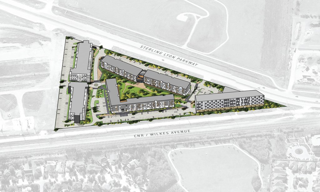 Description: The applicant seeks to subdivide the east side property into two lots, Lot 1 and Lot 2, and rezone Lot 1 to the "CMU" Commercial Mixed Use district to facilitate a multi-family residential development. Lot 1, spanning approximately 1.5 acres, will feature a seven-story building with a maximum height of 74.6 feet, containing 162 dwelling units (a mix of 1, 2, and 3-bedroom units) and 121 parking stalls, including 44 underground. Access to Lot 1 will utilize an existing private street approach to the west, with shared access between the lots enabled by a cross-access agreement. No new access points from Sterling Lyon Parkway are proposed. The Westside of the road has already been zoned CMU, a twin 7 story building will be constructed on this site.
