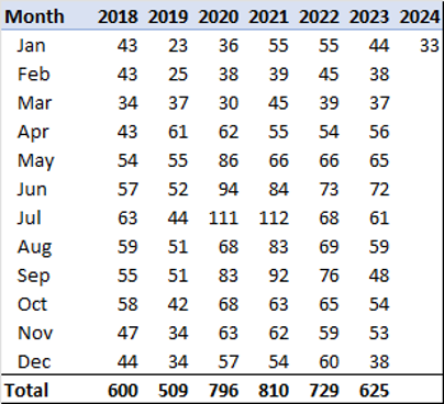 Chicago Homicides by Month & Year: Numbers