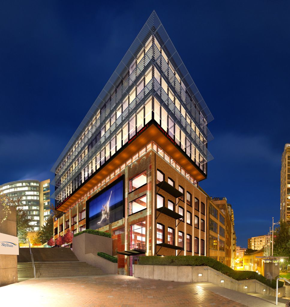 At Beatty and Dunsmuir. Next to the Stadium Skytrain Station. Now under Construction by Reliance Properties. Office Use. 10 Levels including 5 level concrete addition to Heritage Building.