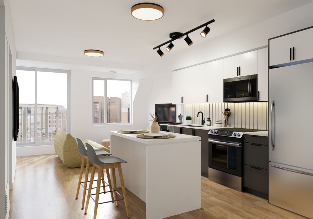 All suites are luxuriously appointed, with high ceilings and large windows for plenty of natural light, walk-in showers, quartz countertops, under-cabinet lighting, luxury vinyl plank flooring and ceramic tile. All suites come with washer and dryer and stainless-steel appliances.
