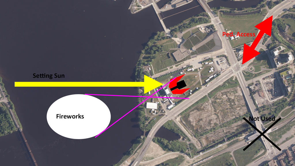 OK, a first look says that a lot of the area is off-limits to the public. That tells me that there is very limited ‘close-up’ public viewing of the Fireworks from the west, south, and east. At best, standing along Albert, or on the north side of the Ottawa River would seem to give the best views. (I recall getting covered in dye spots from standing right under the fireworks at Andrew Haydon Park. Ah, the care-free good-olde days.)