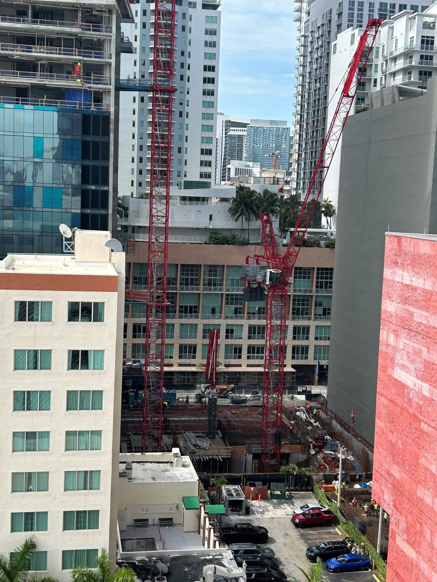 Recent aerial imagery reveals that the superstructure is beginning to make a noticeable impact on the Miami skyline. Formwork has progressed past the 35th floor, placing construction within the fourth offset cube of the tower’s total nine-cube composition. Decking is actively underway for level 36, while the perimeter safety netting system is being jumped from the levels below in tandem with the vertical progression. YIMBY’s previous update in March documented the structure at the 20th floor, suggesting an average cycle time of approximately 8 to 10 days per floor, though this serves more as a general benchmark than a fixed pace. Based on this progress, the tower’s height is estimated to be somewhere between 360 and 380 feet. For context, the Vizcayne twin-tower complex, located across the street to the south, rises 538 feet. The stacked presence of the design is now clearly taking shape, and the tower’s distinctive silhouette will only become more pronounced as additional sections of the curtain wall are installed in the coming months..................