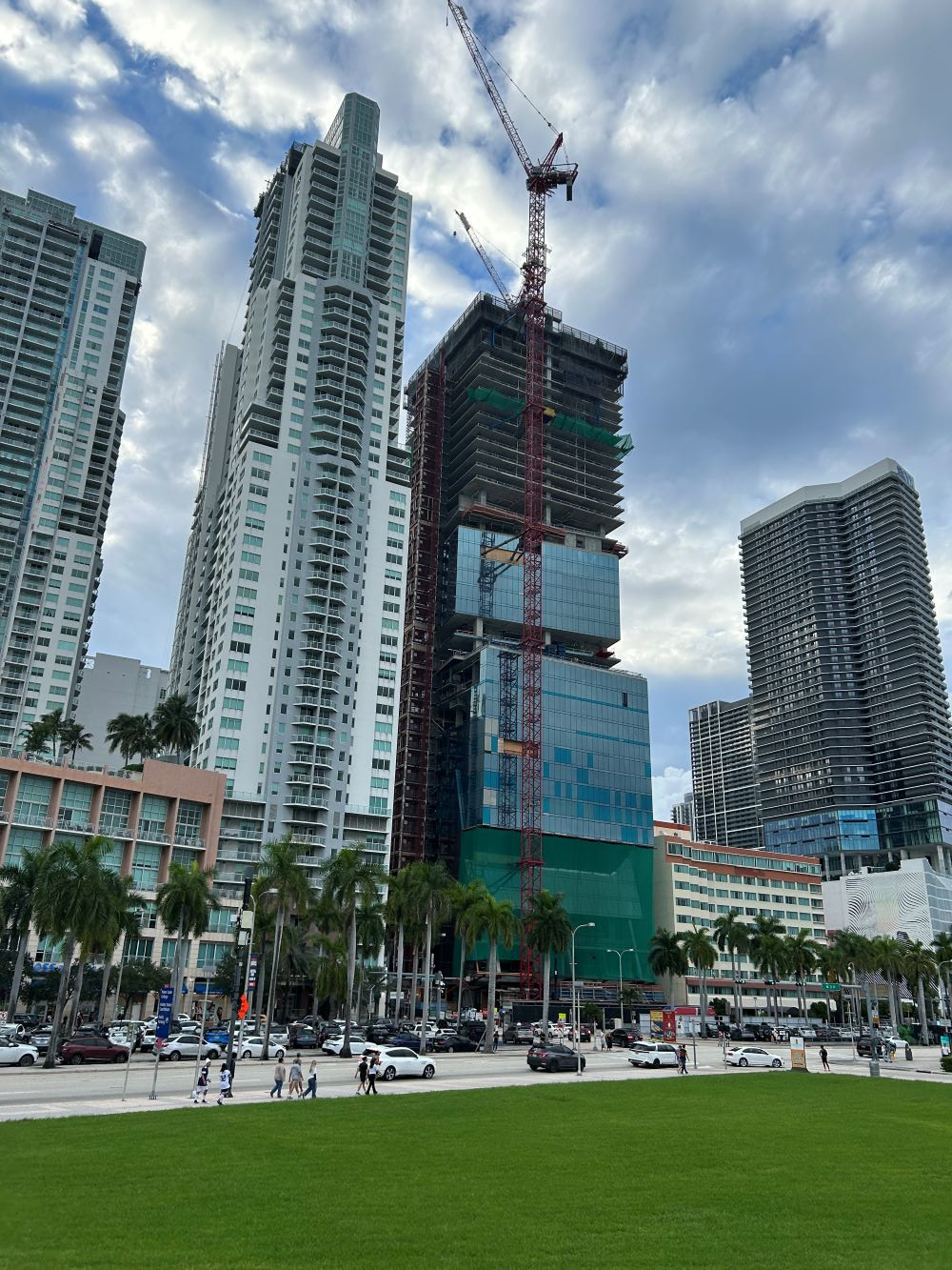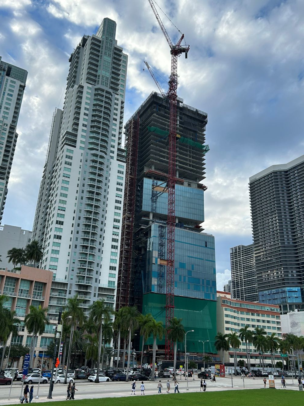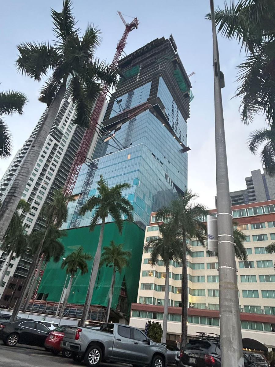 PMG’s PR team provided YIMBY with recent ground and aerial photos of construction progress. Waldorf Astoria Hotel & Residences Miami is rising at an average rate of one floor every 10 days. The tower is composed of nine offset glass cubes arranged in a spiraling vertical formation, producing a distinct silhouette within the Miami skyline. Four of the cubes are now visible as the superstructure continues to ascend. For context, the Vizcayne condominium towers directly across the street, rise 49 stories and 538 feet, illustrating the dramatic height difference the Waldorf Astoria will achieve once the full 100-story profile is complete.....................