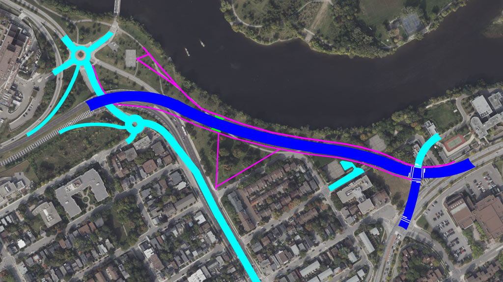 It requires about 700 metres of new 4-lane roadway, plus connections and MUPs. The majority of which can be built without disturbing current traffic patterns. All of the new roadway can be at grade, or slightly above grade so that pedestrian underpasses can be added. In the diagram, I have kept the Macdonald-Cartier Bridge’s ‘tail’ elevated for a bit, so that it doesn’t become a roller-coaster. After passing over the MUP ‘culvert’, it drops to grade so that it can intersect with St. Patrick. There is no need to tunnel anything. Just make it relatively easy for active transportation to cross it. I have a crosswalk where it meets St. Patrick, a MUP ‘culvert’ near the middle, and the Union Lay-up at the other end. The greenspace on both sides of the roadway should be usable.