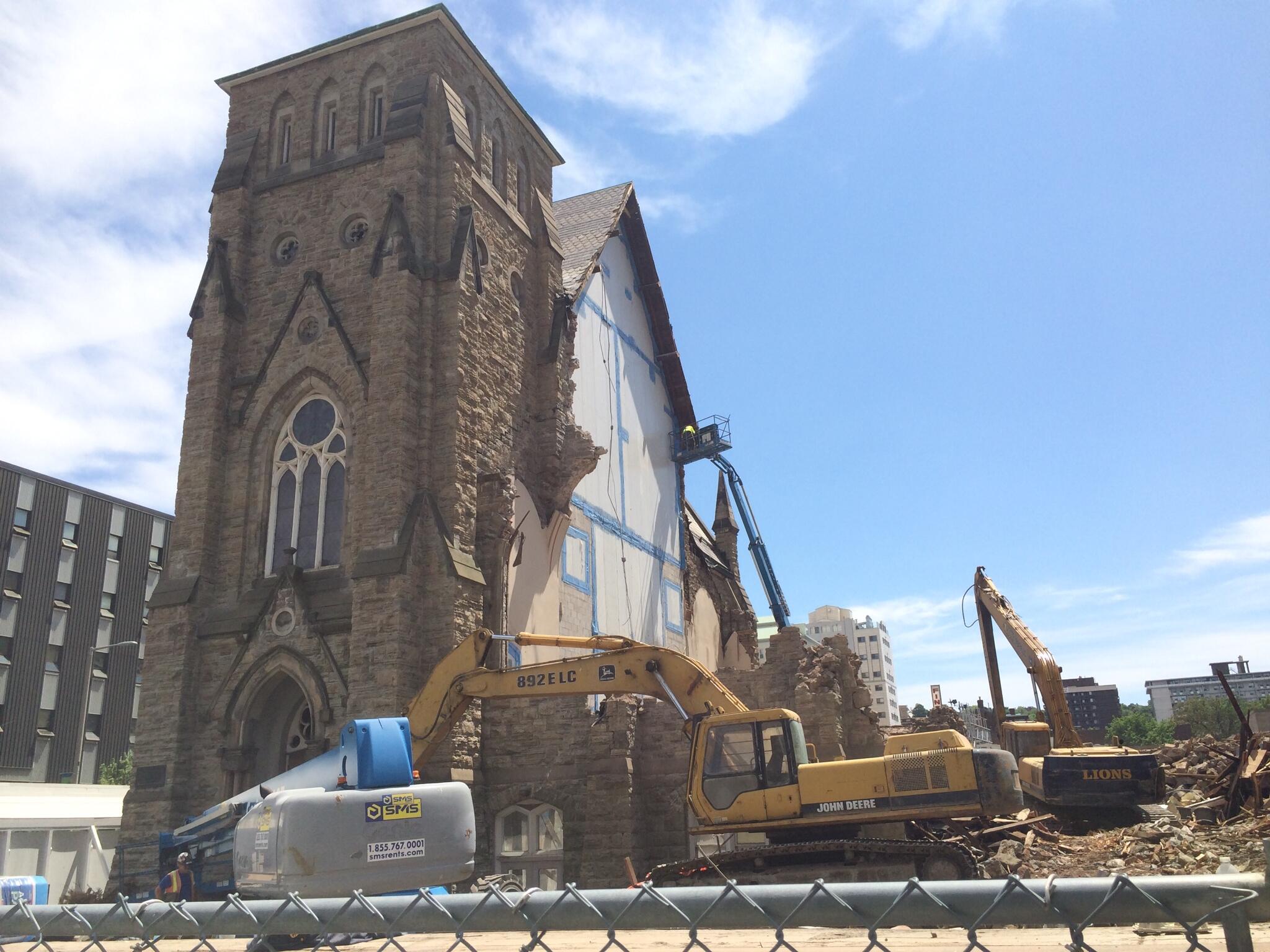 Three of the four sides of the 135-year-old church have already been demolished, leaving just the portion that fronts James Street South standing.