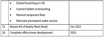 The final design of the Beatty Plant component of the Redevelopment Project is under review by the developer, Creative Energy, the Design Engineer, and the General Contractor. The design presented in the application that resulted in Order C-1-20 involved retaining three of the six boilers in place and abating and removing the three oldest boilers. An alternative configuration is being considered that would involve replacing the existing boilers and equipment at the Beatty Plant with all new equipment still on the Beatty property. This would allow the existing plant to remain in operation while the new equipment is installed and placed into service; the existing plant would then be removed. The alternative configuration is expected to improve the construction schedule, improve maintenance costs and efficiency of the steam plant (as a result of all new equipment), and reduce a great many of the risks associated with the Redevelopment Project and the construction of the office tower at 720 Beatty as compared to the original design.