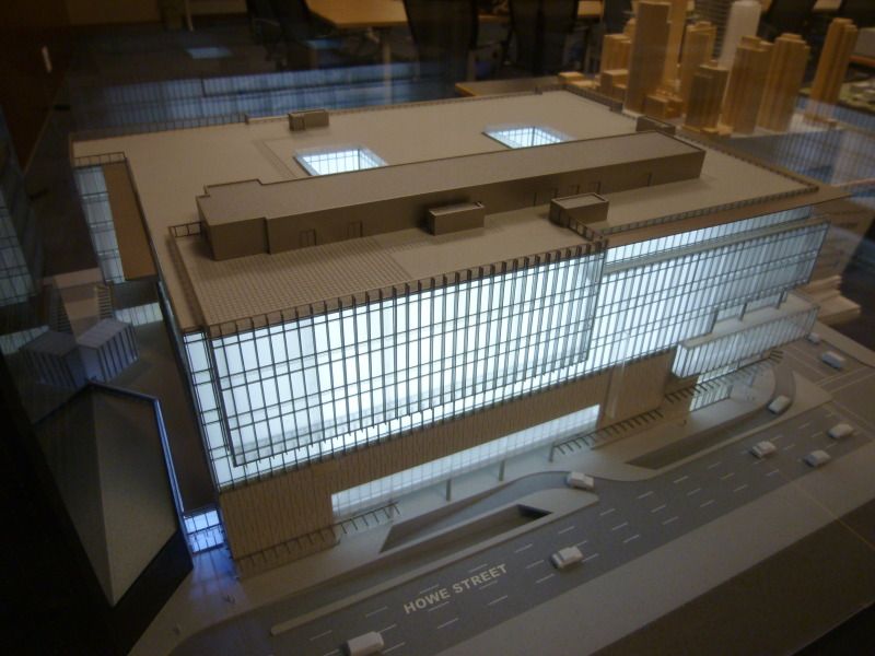 In addition to being an aesthetic letdown which completely snubs its urban context (i.e., the Granville Entertainment District), this design fails to address any of the fundamental pedestrian shortcomings of the old building. All of the old problems remain: blank walls, absent retail, parkade ramps using up vital sidewalk space, etc. This design, in effect, does nothing more than swap a blank opaque wall for a blank transparent wall (and, even then, only in some areas), from the perspective of the pedestrian. Nothing that made the Granville/Robson/Howe sides a flawed pedestrian experience has been ameliorated.