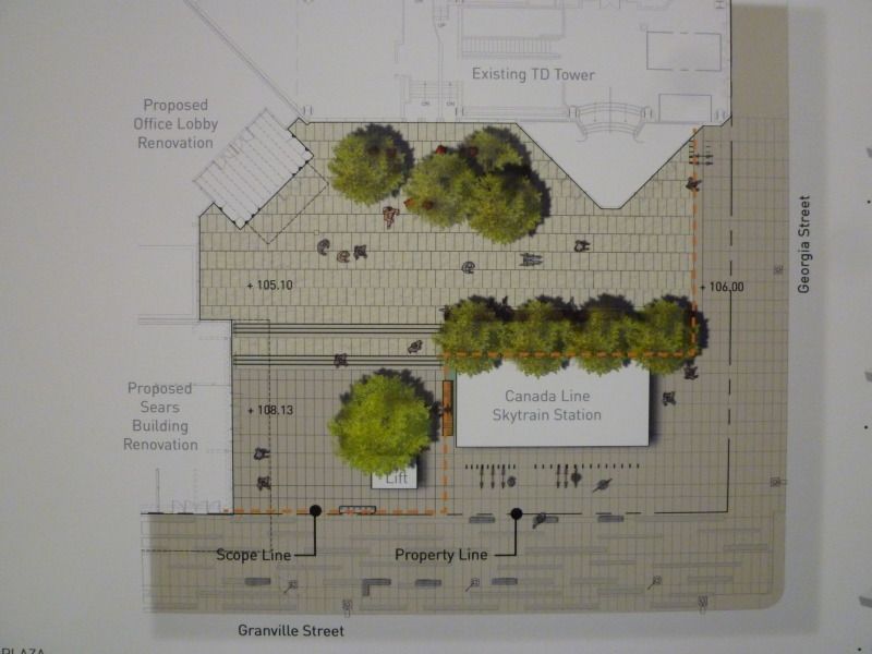 Street. It connects with the TD Tower on the northwest corner of the site and the Canada Line Station on the plaza, with connections to the Expo Line at the lower mall level. He also described the context for the area, noting that four streets surrounding the site are important and unique streets in the downtown district.
