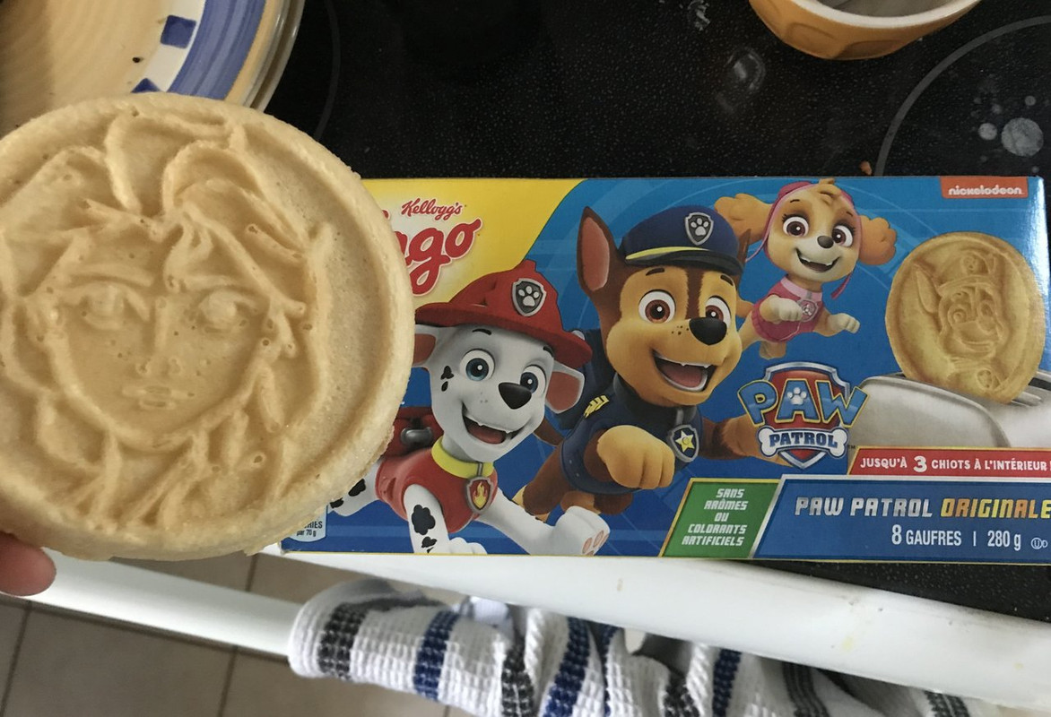 And I can probably end up on Inside Edition or go viral on Youtube with 20 million views with this. One of the Eggos in the Paw Patrol box was of Elsa from Frozen. Two years ago I wouldn't have know who or what those things are, but that shit is on full blast on the TV most days now. And I have yet to see an Eggos box with Elsa/Frozen on it. Just Paw Patrol and Mickey and Minnie Mouse. I googled it and it does existing, I'm just not sure why it's not in any of the half dozen grocery chains I shop in. For all I know it might not even be in Canada.