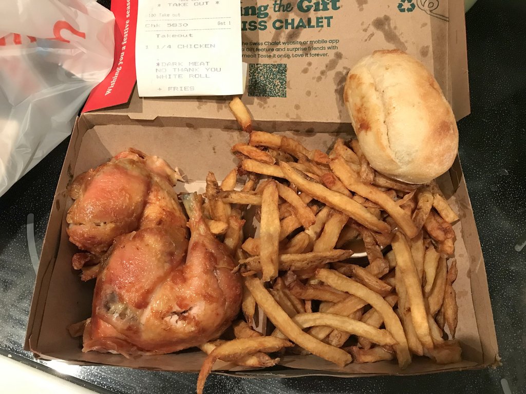 Anyway, for the first time, the app was not processing my card, either directly or through Apple Pay. But my card was working at the store. So I walked in and asked for 1/4 chicken meal. I get home and say wow that's a big box for a 1/4 chicken meal. Opened it up and was pleasantly surprised. That's two quaters and huge serving of fries (the portion looks much heftier in person than in the pic). Good, now I got lunch tomorrow. They had the right name and order on the receipt too.
