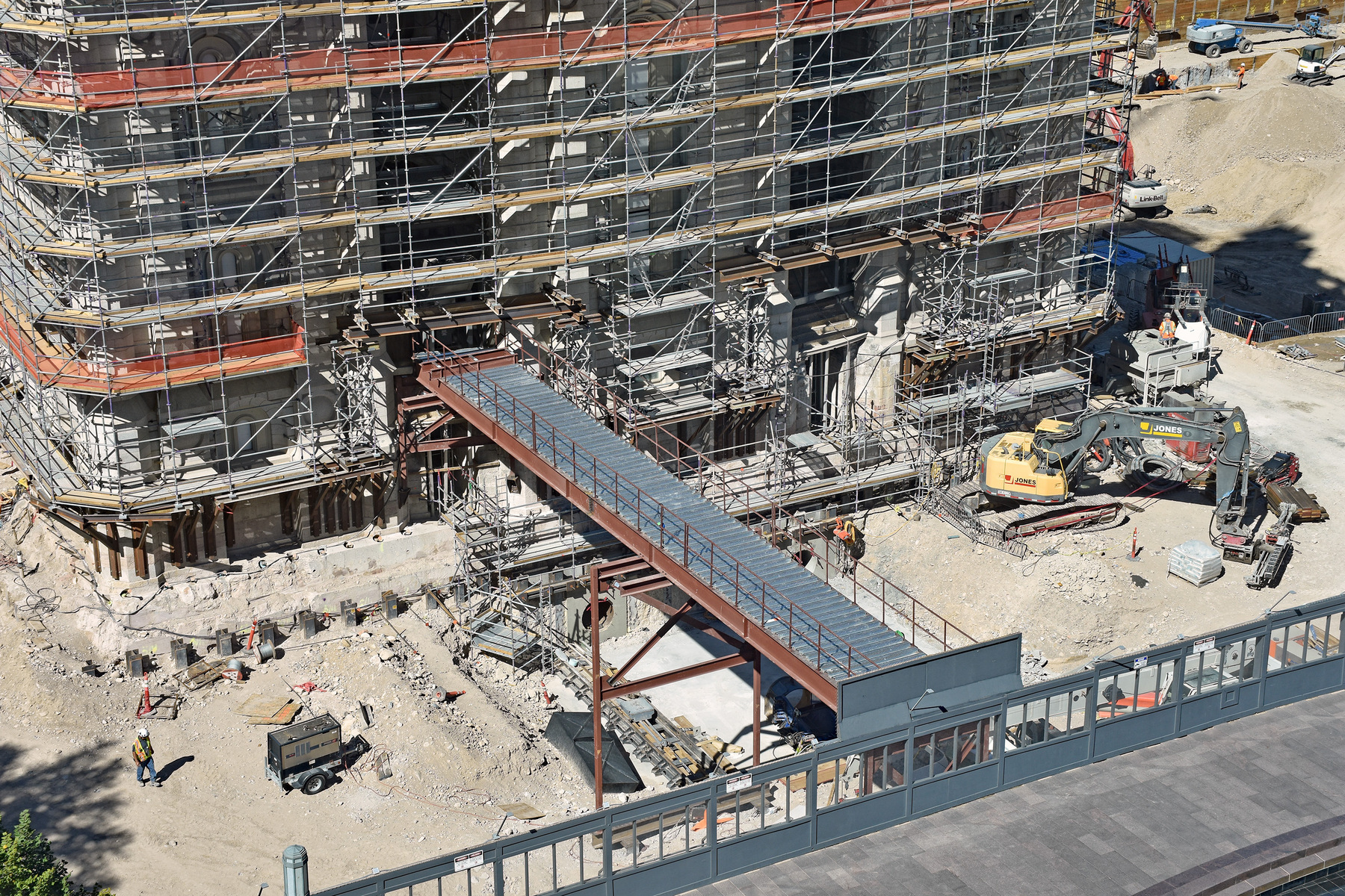 Main equipment being used on the job includes cranes, forklifts, manlifts, light plants, pump trucks and conveyor belt trucks. Concrete, steel, rebar and conduits are among the materials required.