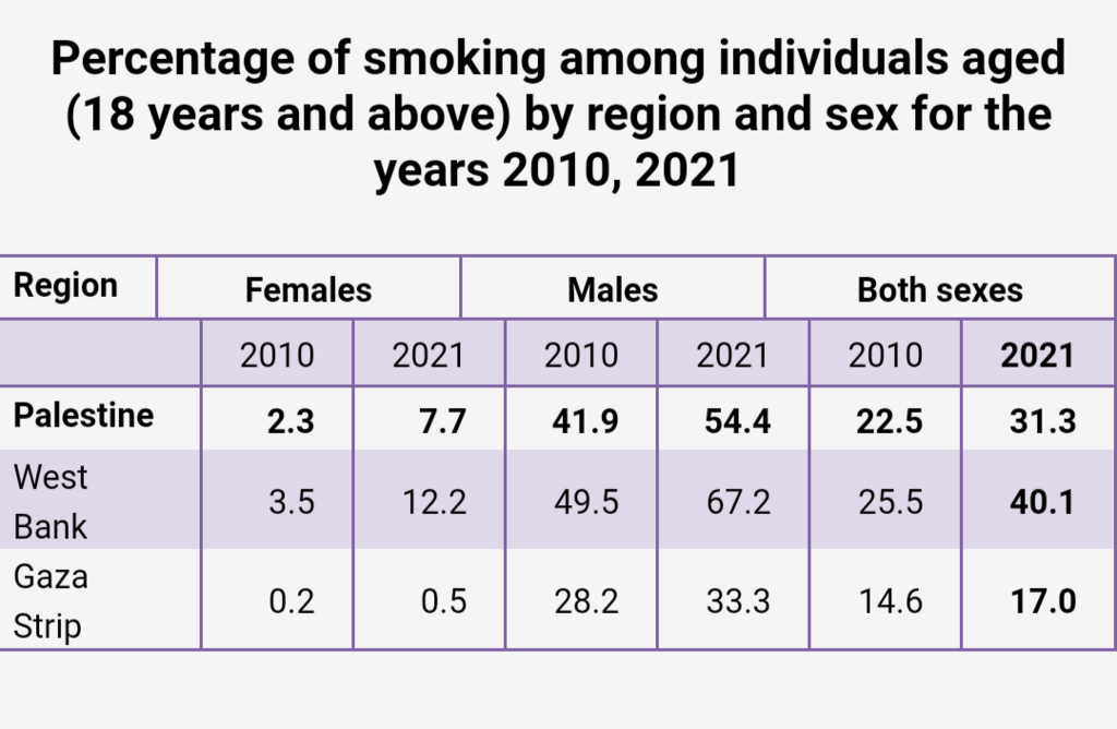I thought it was interesting among Palestinians that smoking rates in West Bank are significantly higher than Gaza. And they were on the rise, generally from 2010-2021. Data from 2021, Pre Oct 7/War/flattening of Gaza.