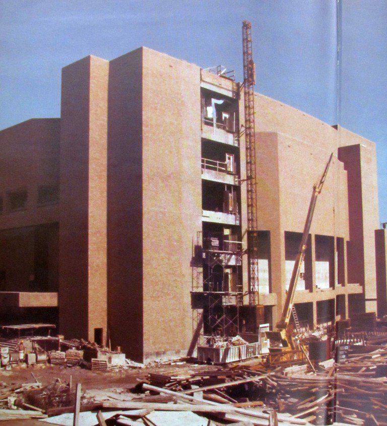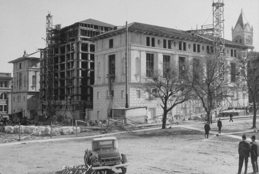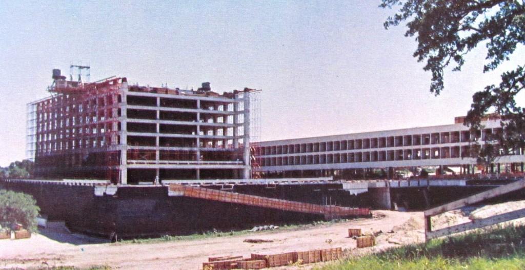 In the lower right of the photo, there's a rectangular shaped building under construction with a red tower crane. That's the J.J. Pickle Federal Building. President Lyndon Johnson had an office in the building even after he became president. It was his office whenever he was visiting home in Texas.