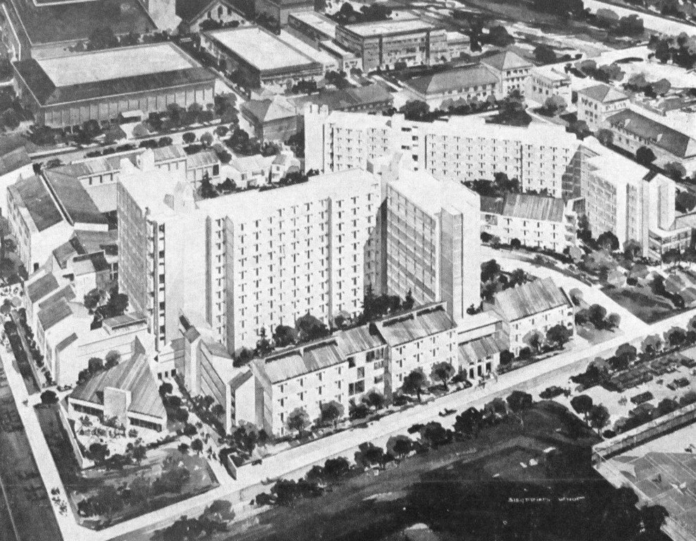 The old red bricked 1915 Brackenridge Hospital building is visible here to the right near I-35. Brackenridge expanded in the 60s through the 70s with a new tower, but the 1915 building was also expanded until it was demolished in 1984. Brackenridge Hospital was the oldest publically owned hospital in Texas. It was founded in 1884 and closed completely in 2017 after the University of Texas built a medical school across the street that replaced it.