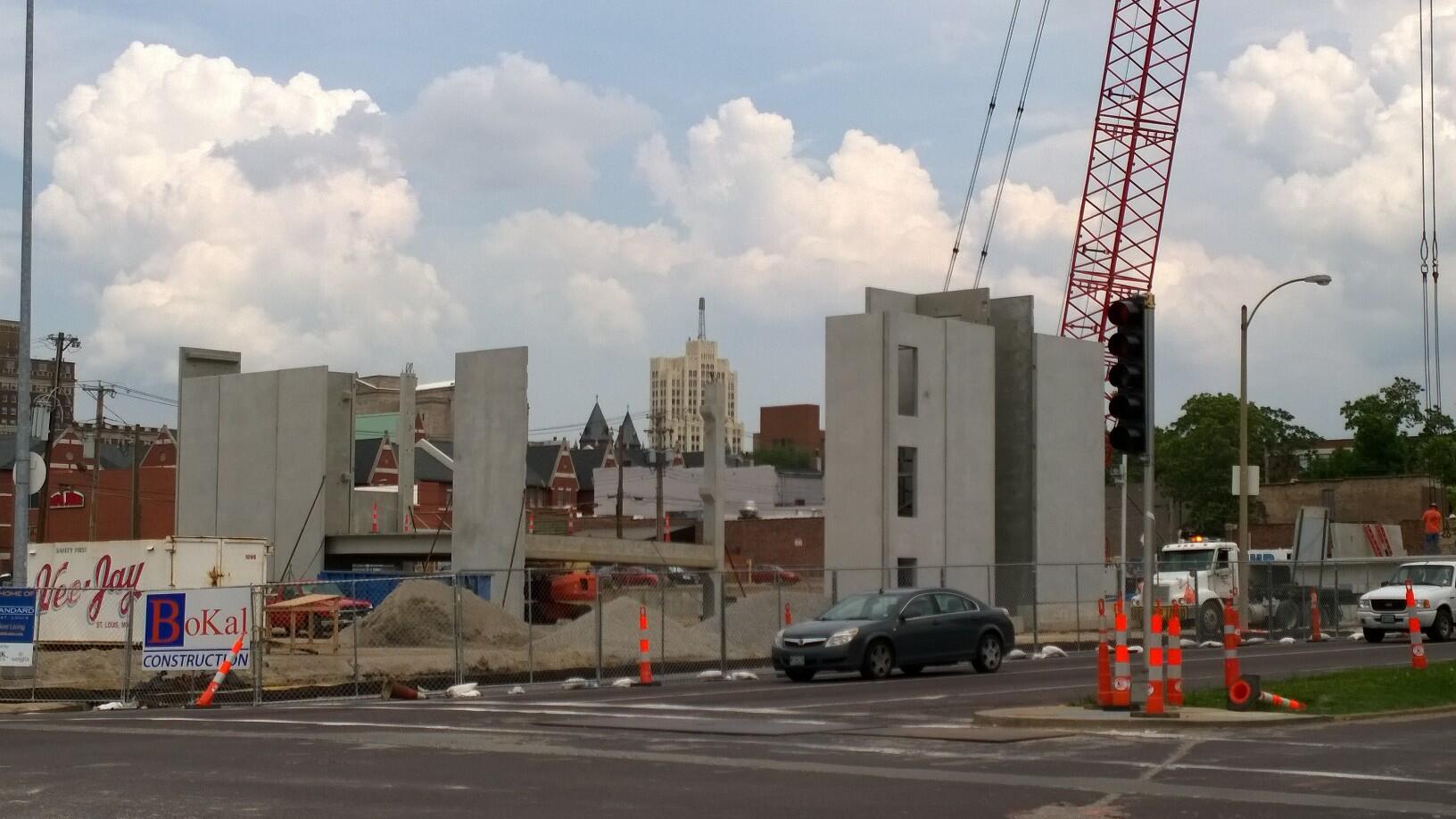 A tower crane is up on the site of City Walk on Euclid, the Central West End apartment project that includes a Whole Foods Market.