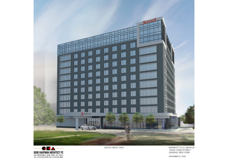 Construction has started for an eleven-story Marriott hotel at John F. Kennedy International Airport, in Queens. The 270,000-square foot structure will create 540 rooms, along with 4,000 square feet of meeting space, a lounge, a drinking establishment, offices, a fitness center, and parking. Gene Kaufman Architects will be responsible for the exterior design, as well as the interiors, public spaces, and guest rooms.