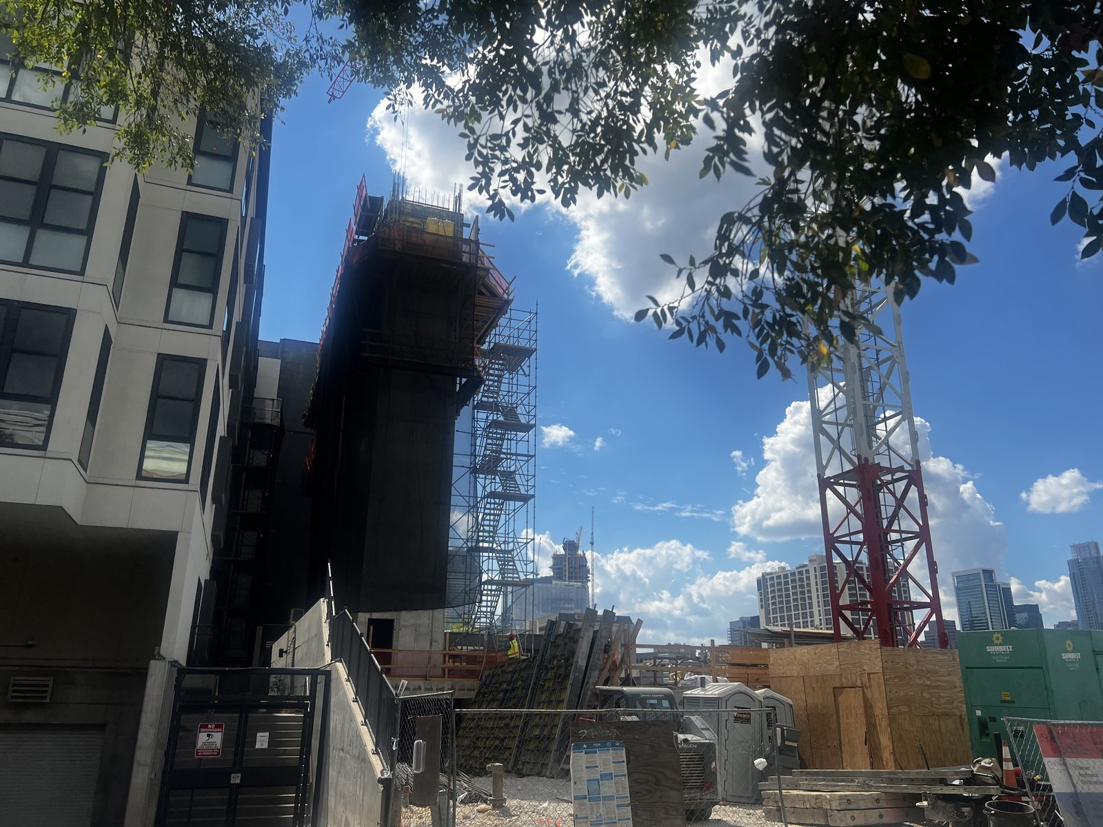 Also worth mentioning that a few of these buildings are set back a bit, partly because of easements/utilities, etc., but likely also because they don't want to put someone's living room windows and balcony quite so close to the road noise from the highway -- once the reconstruction is complete, we'll hopefully start seeing some tighter spacing like you'd see elsewhere downtown and in East Austin to cut down on the demarcation line a bit.