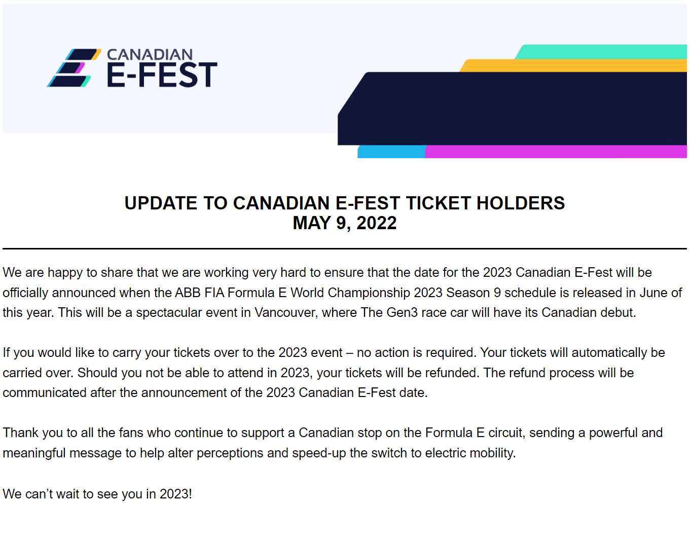 The promoter of the electric car race and festival that were supposed to happen Canada Day weekend says a decision on whether to refund tickets awaits confirmation of the 2023 ABB Formula E World Championship schedule.