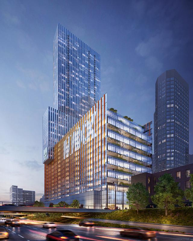 This look oddly similar in terms of the strange, differently designed, overlapping masses that bkL designed for parcel 'O' at Lakeshore East. The overall massing at both the lower area along the highway, and the tallest portion perpendicular to that, just seems so broad and foreboding. It doesn't feel like a welcoming design; it's just a choppy, ham-fisted amalgam of parts that would seemingly work better alone than as the assemblage shown in the renders.