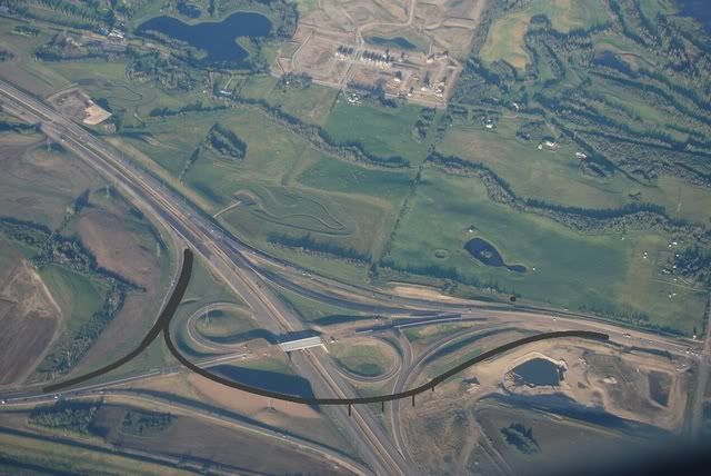 Edit: OD, that is the Anthony Henday - Ray Gibbons/184 St interchange in northwest Edmonton. The earthworks there are for a future stage where eastbound Henday traffic (coming from the top left of the picture) will use a flyover to turn north on Ray Gibbon without stopping at a light, as in the current configuration.