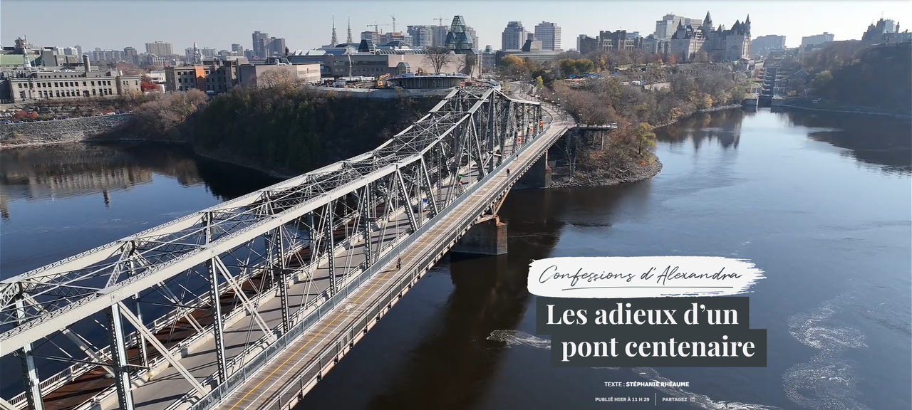 Ce n’est pas tous les jours que s’éteint un emblème de la capitale fédérale. Avant que le pont interprovincial ne soit démoli pour de bon, nous avons voulu faire entendre sa voix. Cette grande dame qui a servi la région pendant plus d’un siècle, Alexandra, signe ici une dernière lettre avant de faire ses adieux à tous ceux qui ont fait un bout de chemin avec elle.