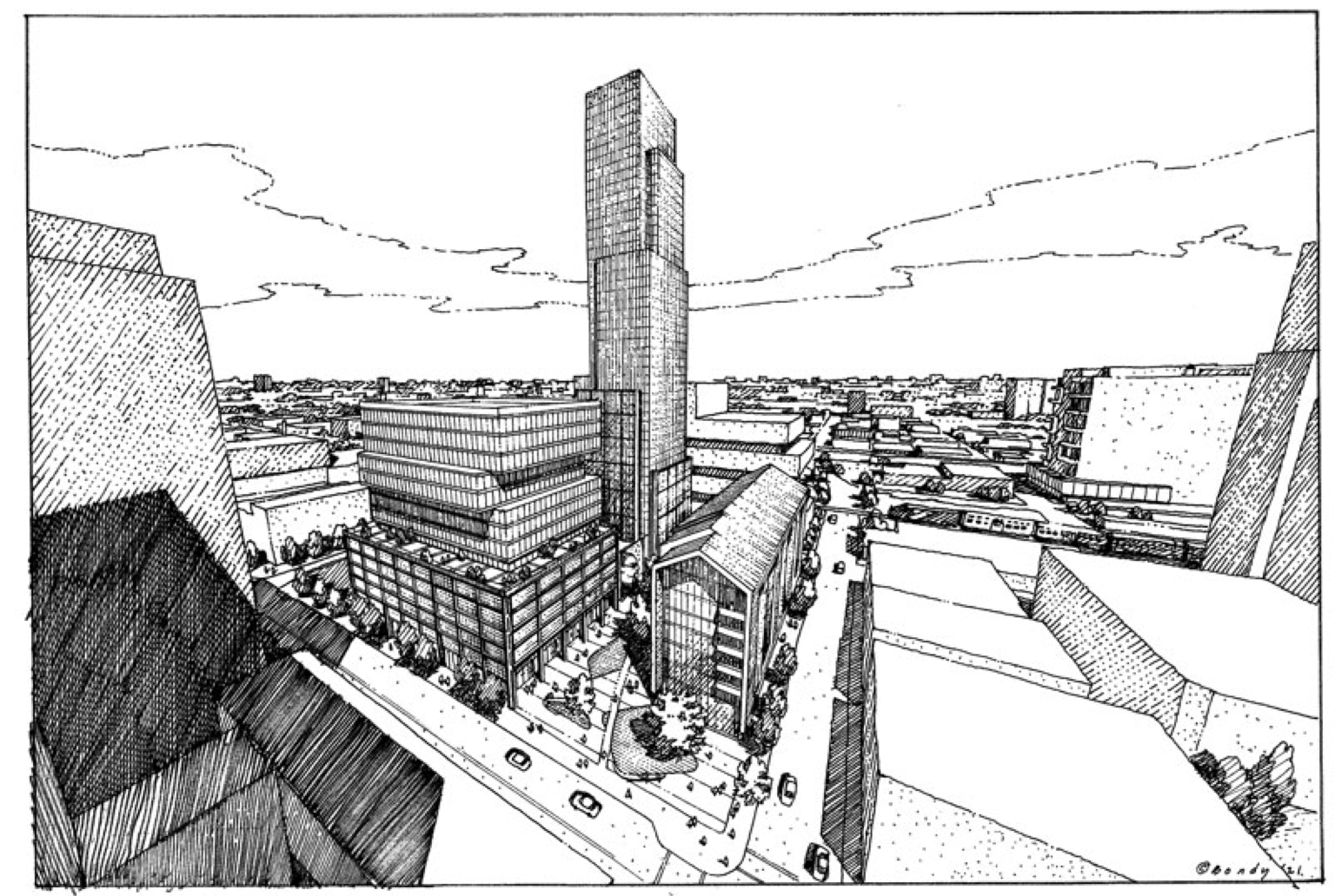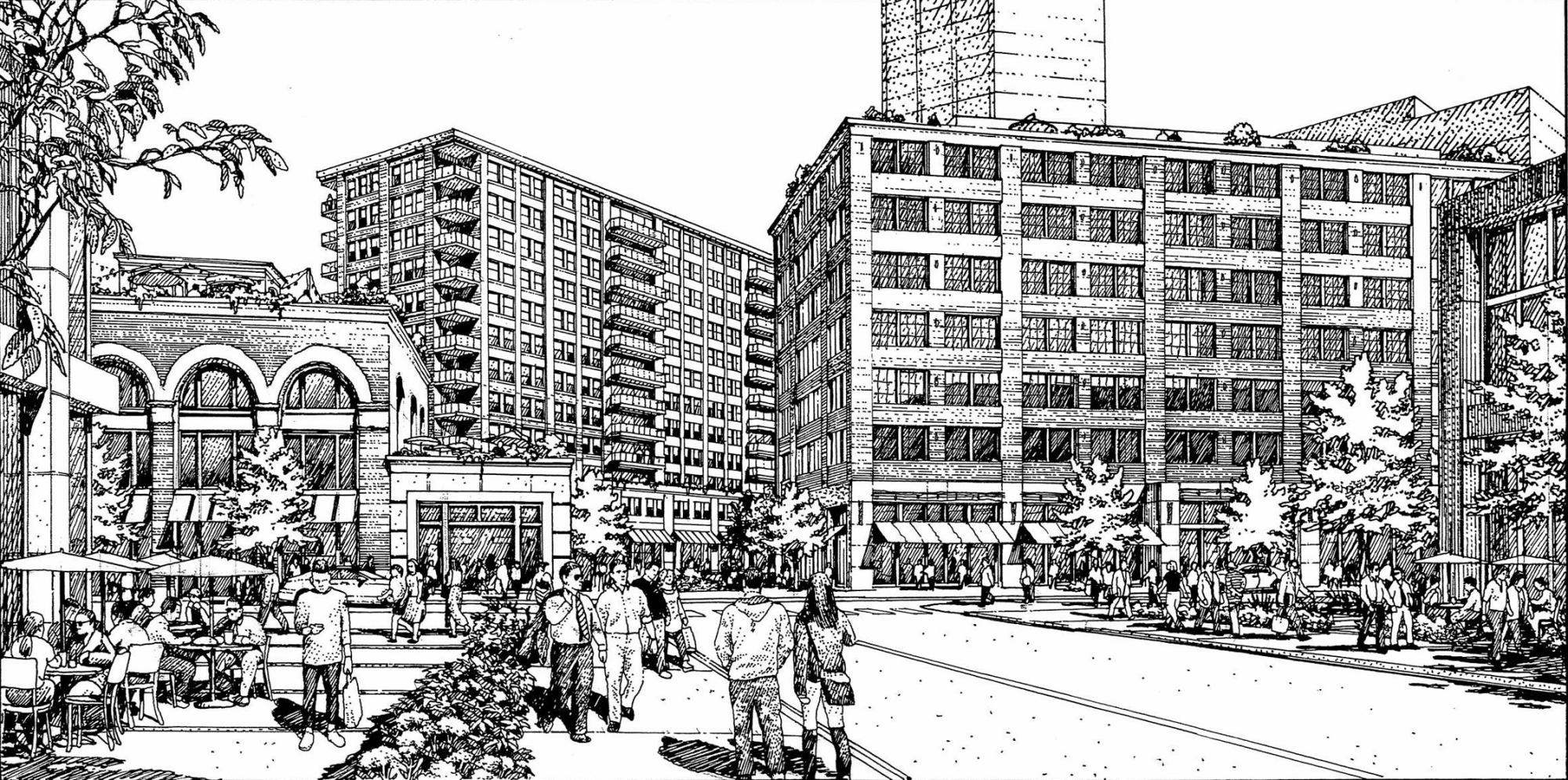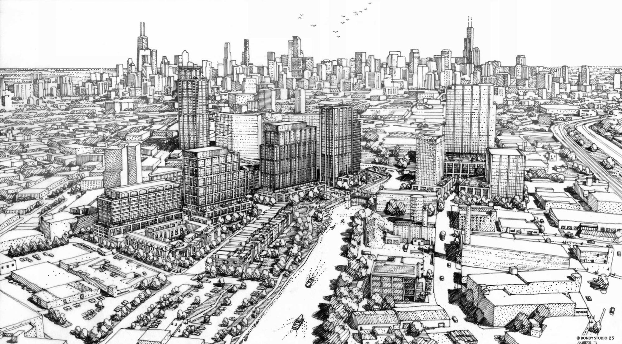 Looks like Foundry Park will very much be a highrise neighborhood with some lowrises and midrises, according to the overall site plan. The article includes more detailed photos of the site plan, such as showing bike lanes and a potential 606 extension.