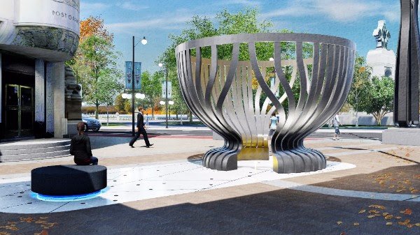 A 20-foot-tall stylized depiction of the cup, with a larger-than-life sculpture of Lord Stanley holding his original cup in his hands. A young boy and girl face off in front of him.